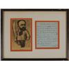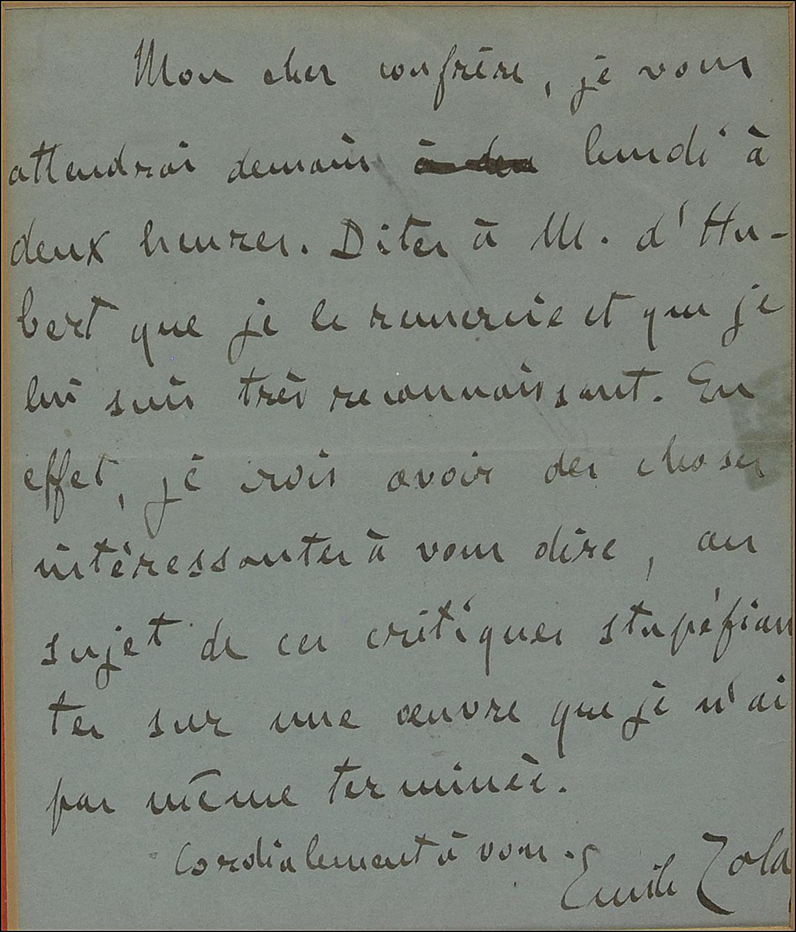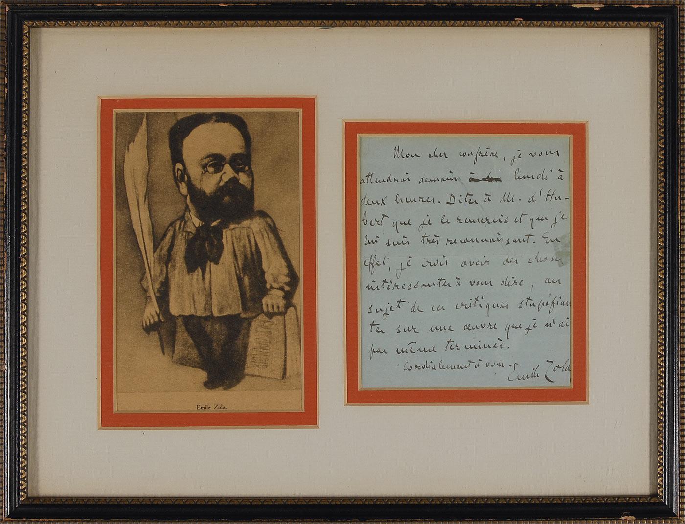 Prolific French journalist, novelist, and activist (1840–1902) best known as one of the leading figures of naturalism and for his inflammatory 1898 open letter, ‘J’Accuse!,’ which exposed the anti-Semitism of the French press and government in the infamous Dreyfus Affair. ALS in French, signed “Emile Zola,” one page, 4 x 4.5, no date. In full (translated): “I will wait for you tomorrow Monday at 2 pm. Tell Monsieur Hubert that I thank him and am very grateful to him. Indeed, I believe that I have some interesting things to tell you regarding those astounding critiques on a work which I have not yet finished.” Double-matted and framed with a caricature to an overall size of 12.75 x 9.75. In fine condition, with central horizontal fold and show-through from a small square of tape staining on the reverse lightly touching two words of text. A wonderfully sarcastic response to his critics!