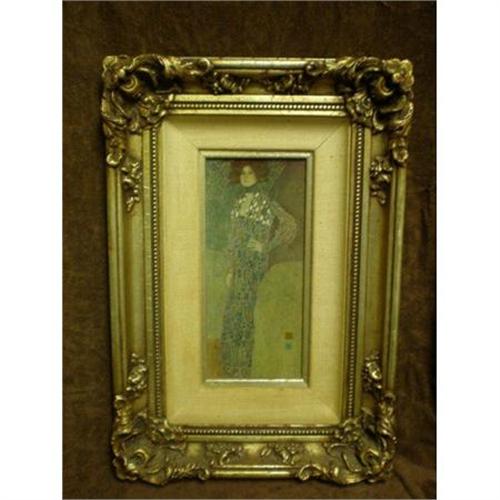 Emilie Floge by Gustav Klimt Print copy. This one is in a very beautiful frame, as you can see. Now the size of the frame is 20" H X 13" W, and the print copy is 5" W X 10.5" L. Now we all know this is just a copy put on board, but what thru me off was the great size of it, and of course, the very beautiful designed old frame. Now I believe that some just took it and pasted or put it on a board, that is what I think, I am not a pro, but some friends of mind figure that is why it is on board. The marking on it are shown in photos, know nothing about them, or what they stand for. I do know it is a very beautiful one and will grace any wall it hangs from. Just because of the nice old frame, and the great way it looks, I am asking for that price. You will yell me what it's worth by your bids. I want you to know that I am calling this a copy of the print, not the real thing. A great decorative item to hang on any wall. Now if you know more about it, I would appreciate any and all input. I have several other photos, and as you see, on the back photo, they even spelled her and his name wrong. So I will leave it up to you. Just for the beautiful piece it is, and it shows it's age well. Hope you enjoy it and I love the size of it, as all other print copies are like 21" by 23" and this one was so much smaller, and just so great looking. I hope you enjoy it as much as I have.