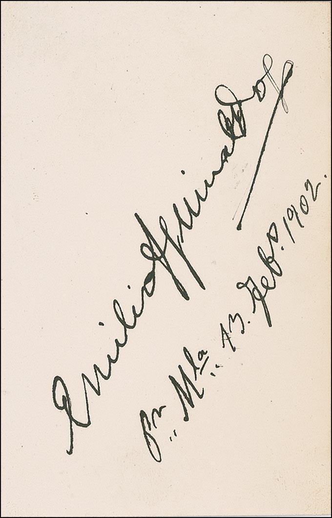 First president of the Philippines. Commander of the Filipino forces in rebellion against Spain; he later led an insurrection against American authority. Fountain pen signature, “Emilio Aguinaldo” adding the date February 13, 1902, on an off-white 4 x 2.5 card. Obtained while Aguinaldo was a prisoner of American forces in the Philippines. In fine condition, with faint edge toning and some show-through from mounting remnants on the reverse. Accompanied by a 1902 transmittal letter from US General Adna Chaffee referencing the signature.