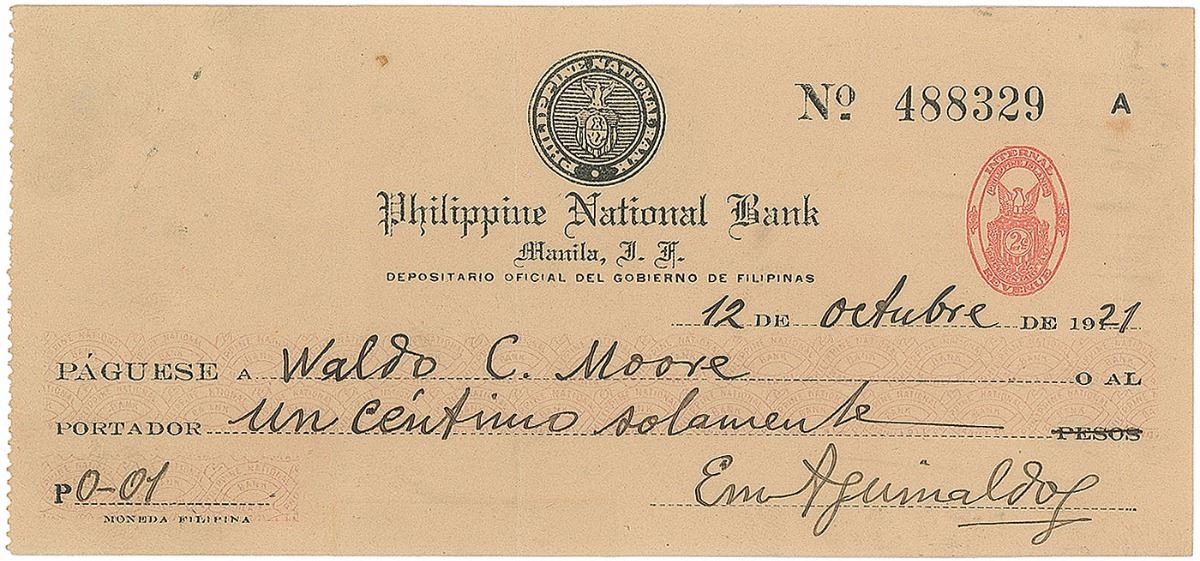 Filipino revolutionary, politician, and a military leader (1869–1964) who is officially recognized as the first president of the Philippines. Philippine National Bank check, 6 x 2.75, filled out and signed by Aguinaldo, payable to Waldo C. Moore for “un centimo solamente,” October 12, 1921. In fine condition. In addition to being an avid numismatist and philatelist, Moore earned a reputation for his world-class collection of autographed checks. During his lifetime, the Ohioan banker sent hundreds of requests to celebrities, asking each to respond with a signed bank check for one cent. Moore checks are coveted by collectors for both the reliability of their authenticity and the highly respected status of their recipient.