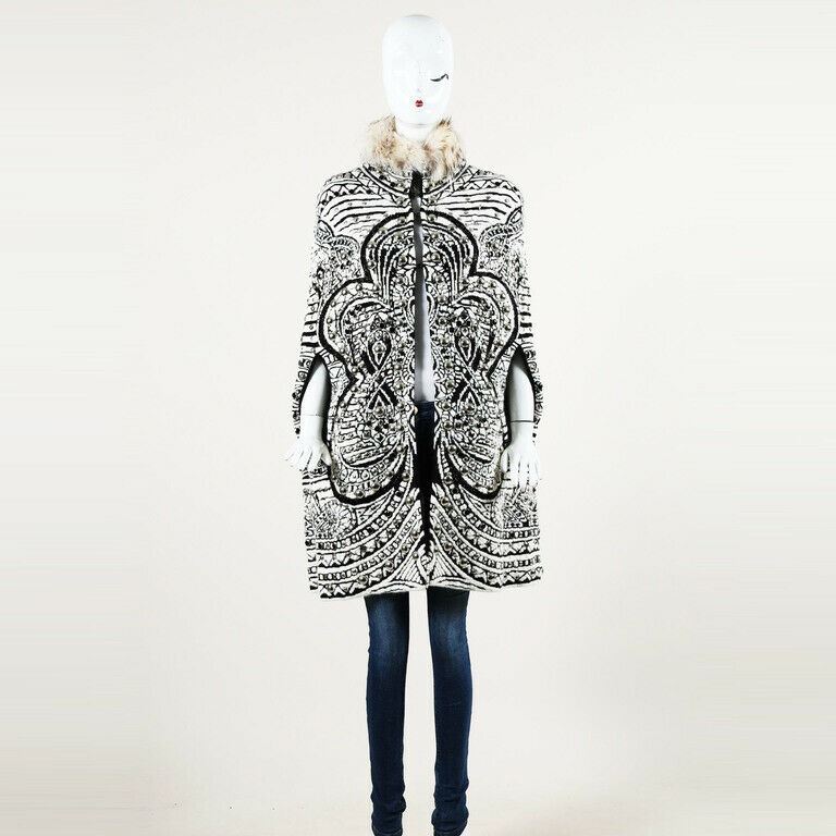 Emilio Pucci jacquard wool knit cape features American badger fur trim, studded embellishments, and front hook and eye closures. Unlined. Circa 2013.