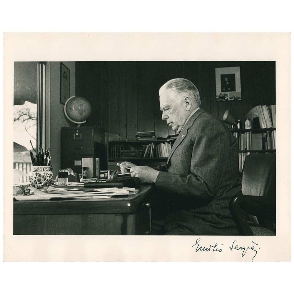 Italian-American physicist (1905–1989) who discovered the antiproton, worked as a group leader for the Manhattan Project, and won the 1959 Nobel Prize in Physics. Vintage matte-finish 10 x 8 photo of Segre at his desk, signed in the lower border in fountain pen. In fine condition, with light edge rippling.