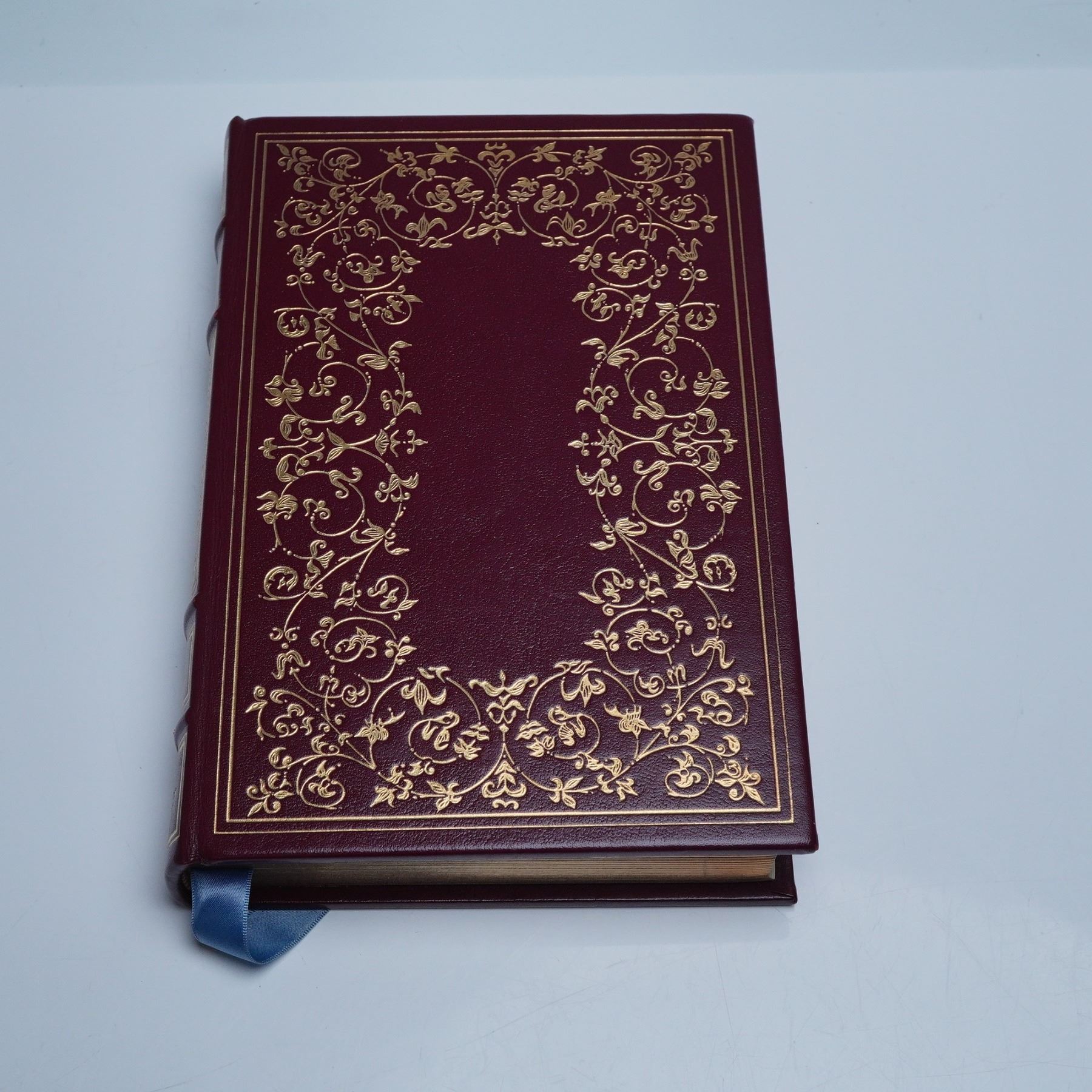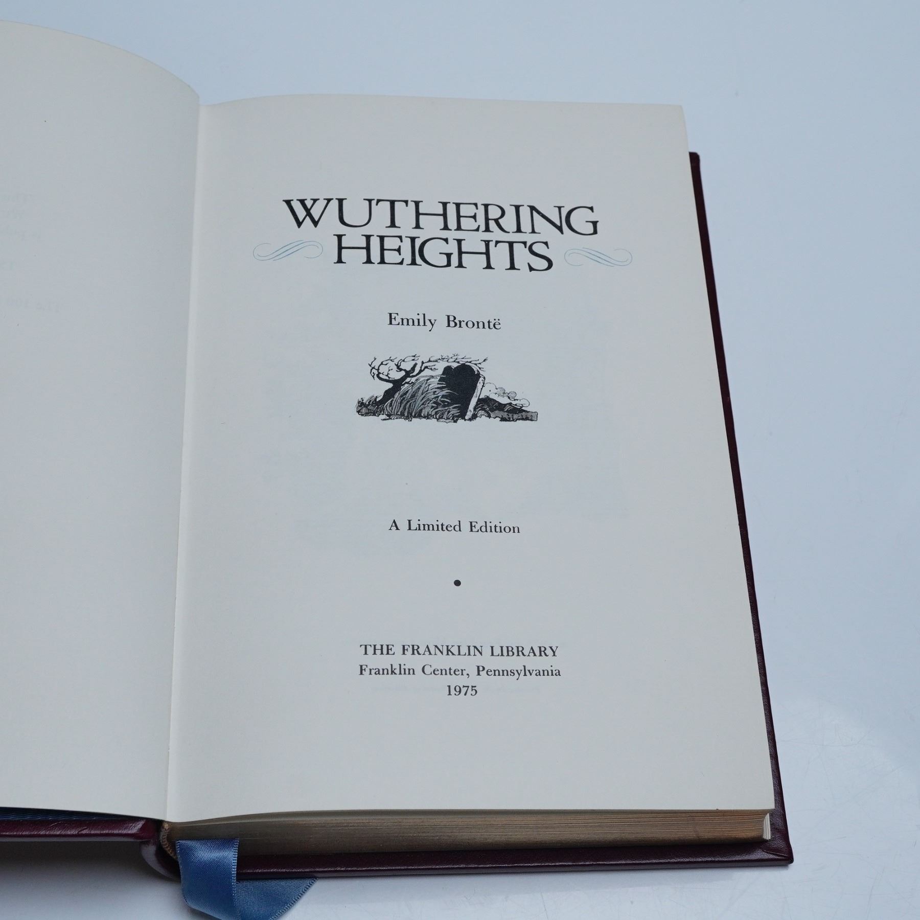 Franklin Library limited edition of Wuthering Heights by Emily Bronte, published in 1975 at Franklin Center, Pennsylvania. Bound in burgundy leather with an ornate floral gilt design on the front, back, and spine. This collector's edition features hubbed spine bands, moire endpapers, a blue satin ribbon bookmark, and gilt page edges. Printed on archival-quality paper for subscribers to the Franklin Library series. Measures 6.5"L x 9"H. 338 pages.