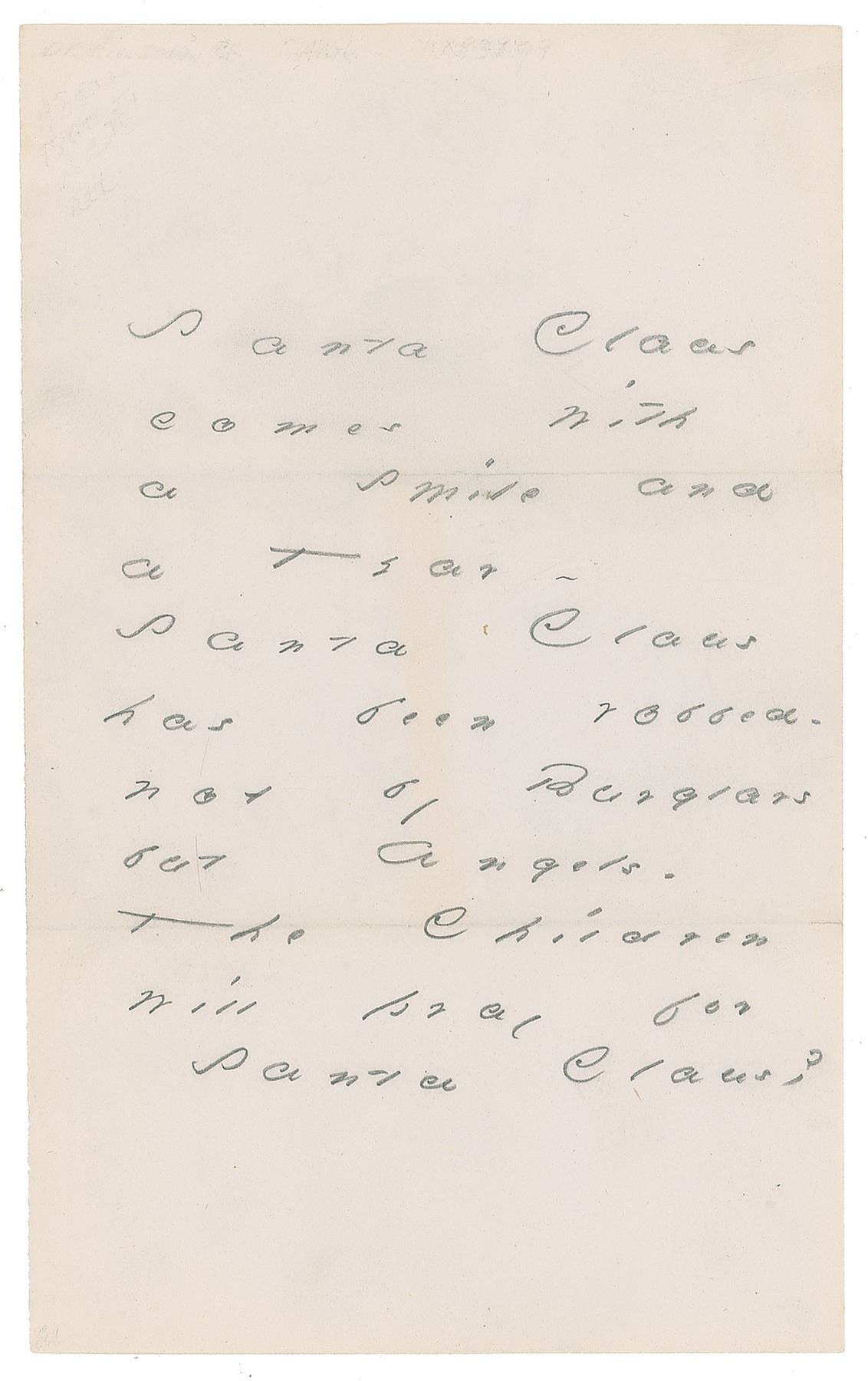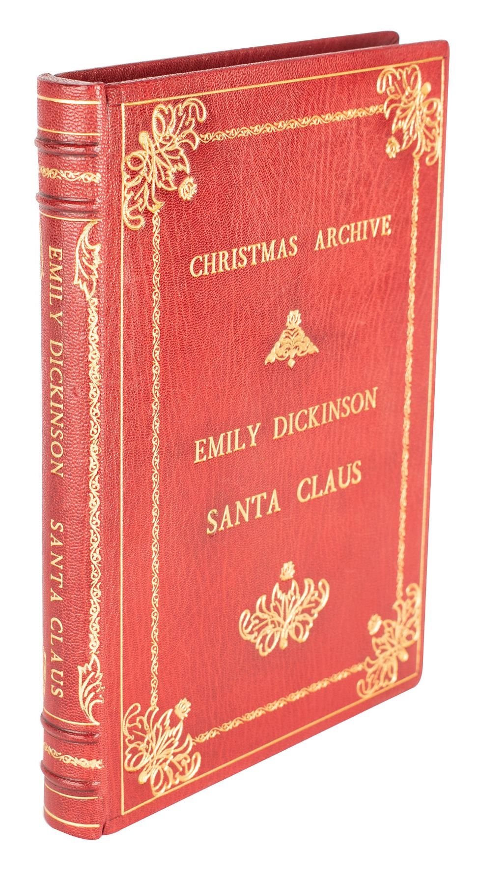 Amazing handwritten 'letter-poem' in pencil by Emily Dickinson, one page, 5 x 8, no date but likely circa Christmas 1883 [as dated by Thomas H. Johnson, editor of Dickinson's letters]. Dickinson writes to Adelaide Hills, in full: "Santa Claus comes with a Smile and a Tear. Santa Claus has been robbed, not by Burglars but Angels. The Children will pray for Santa Claus?" In fine condition. Accompanied by a handsome custom-made full leather case with gilt titles and decorations. Any autographic material from Dickinson—a recluse who did not achieve notoriety in her lifetime—is extraordinarily rare, and this is the first we have ever offered.