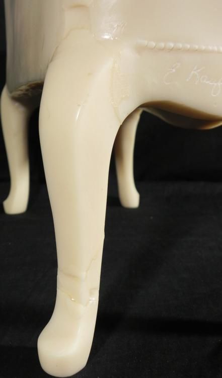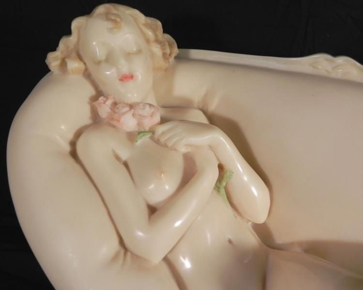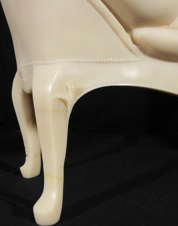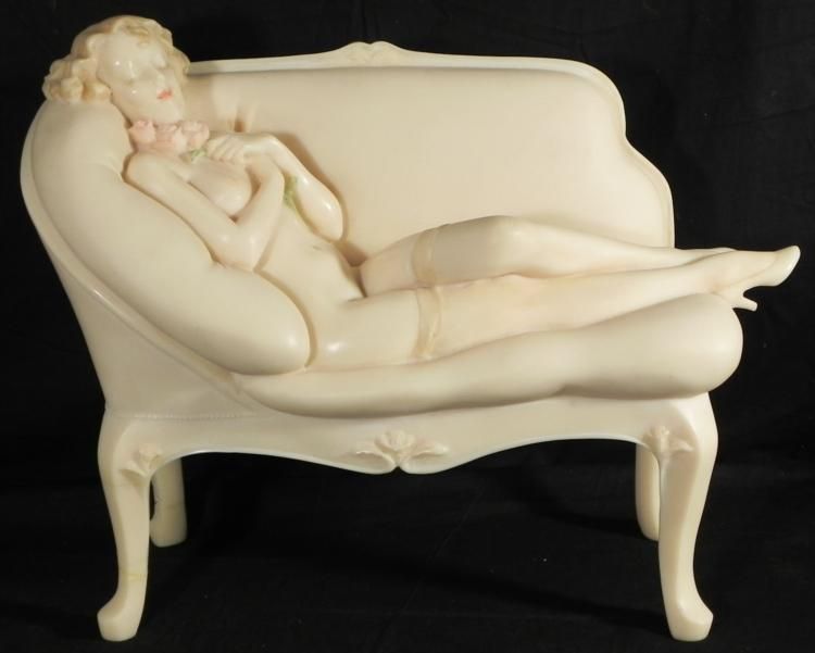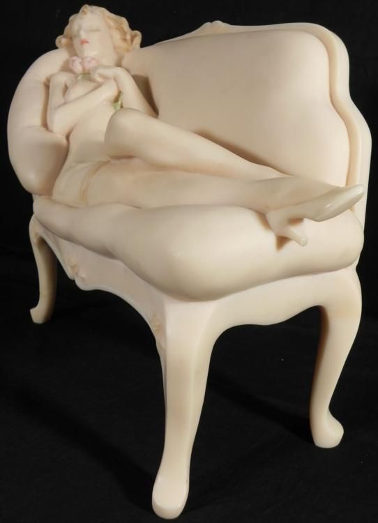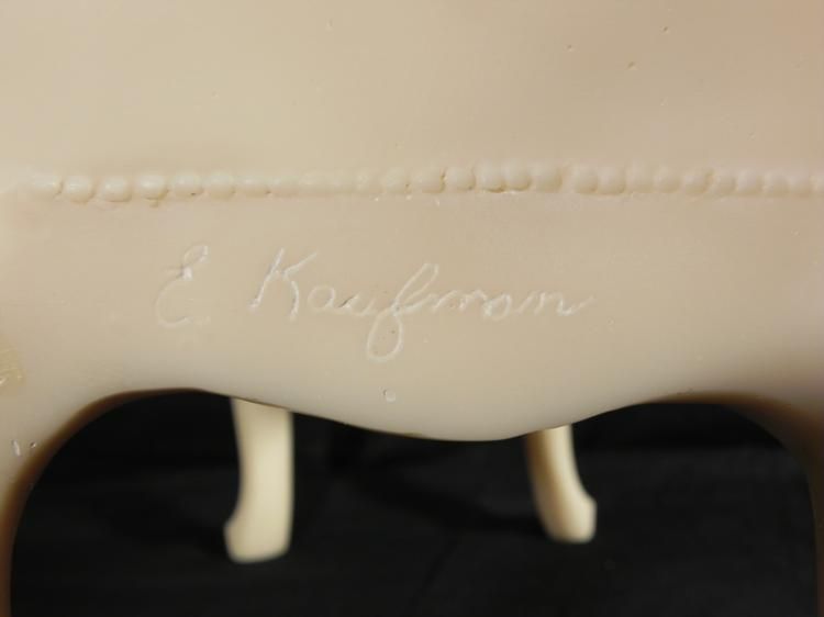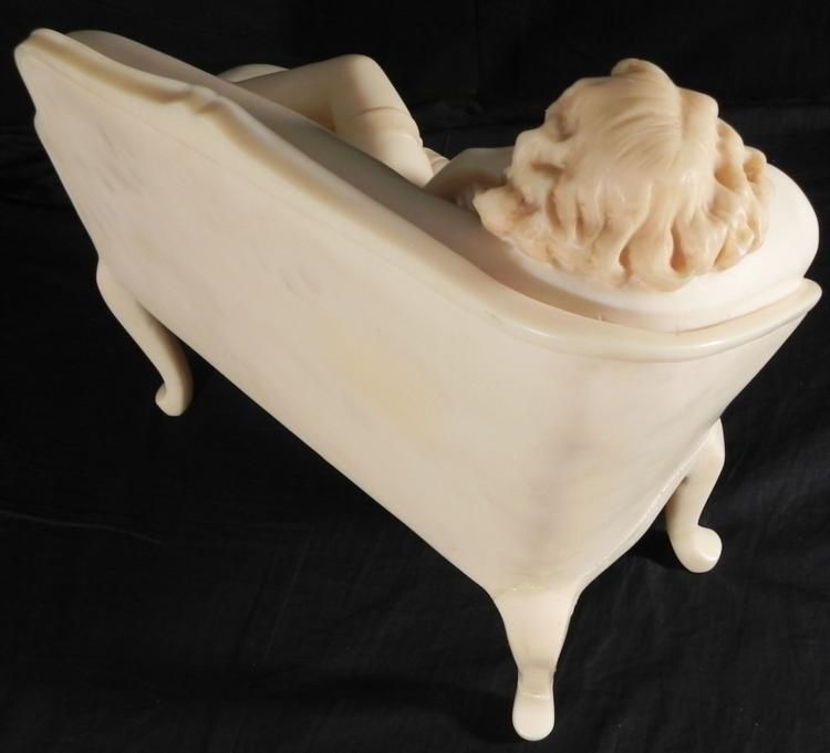 This sculpture is of a lovely lady, in beautiful nude form, holding a delicate rose. Artist: Emily KaufmanSignature: Signed on the backTitle: Girl on Fainting CouchMedium: Three-dimensional and hand-tintted resin cast from original clay modelYear: 1975Dimensions: 21 x 17 x 8 inchesCondition: Fair; some damage to the legs of the couch, but repairs hold the piece together just fine Biography Sculptor Emily Kaufman was born in New York City in the 1950s, and raised in the Washington DC area. Her collegiate fine arts studies brought a B.F.A. from Boston University and an M.F.A. from the University of Illinois. At the latter institution, she worked closely with renown international sculptor, Frank Gallo. Emily Kaufman s art exhibits a dramatic realism and as a result, each piece belies her sincere emotional connection to it.
