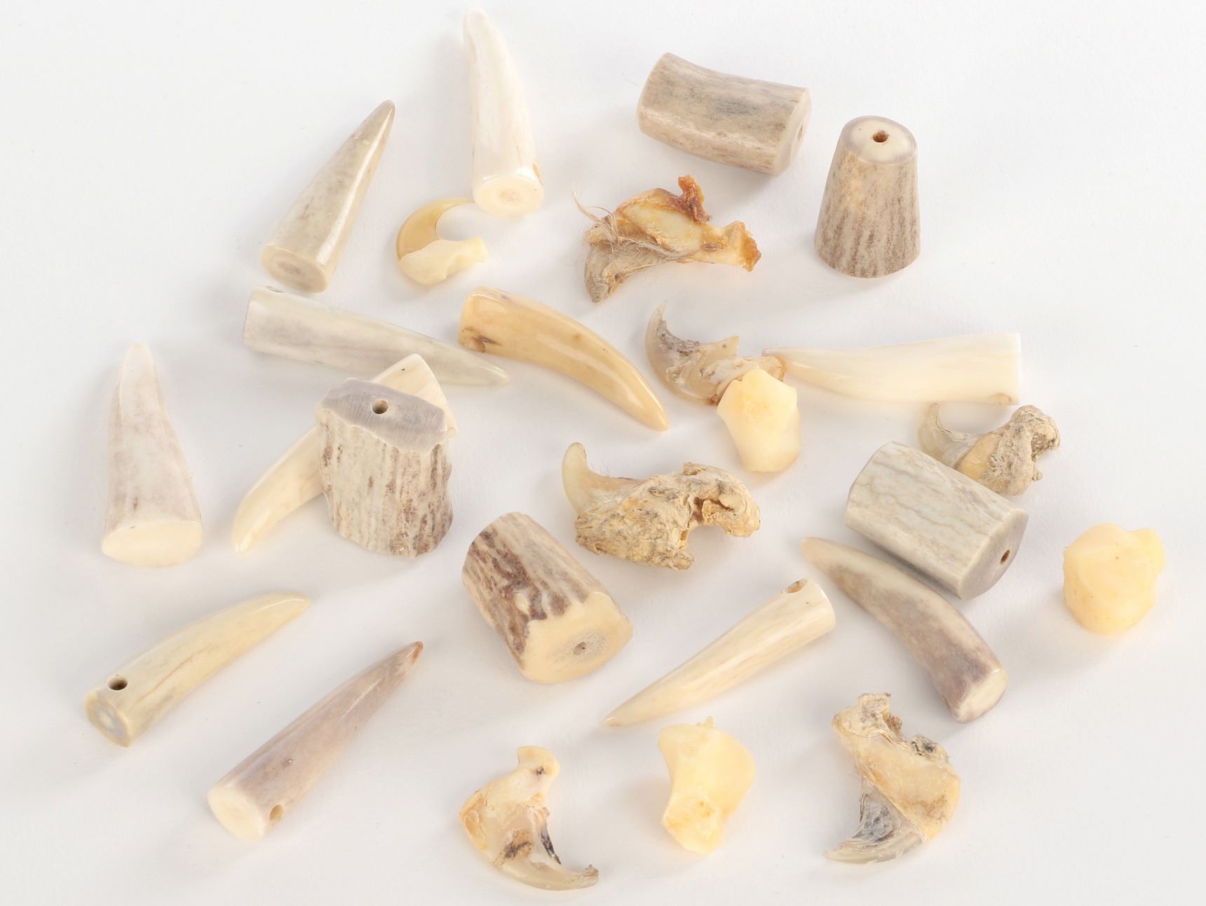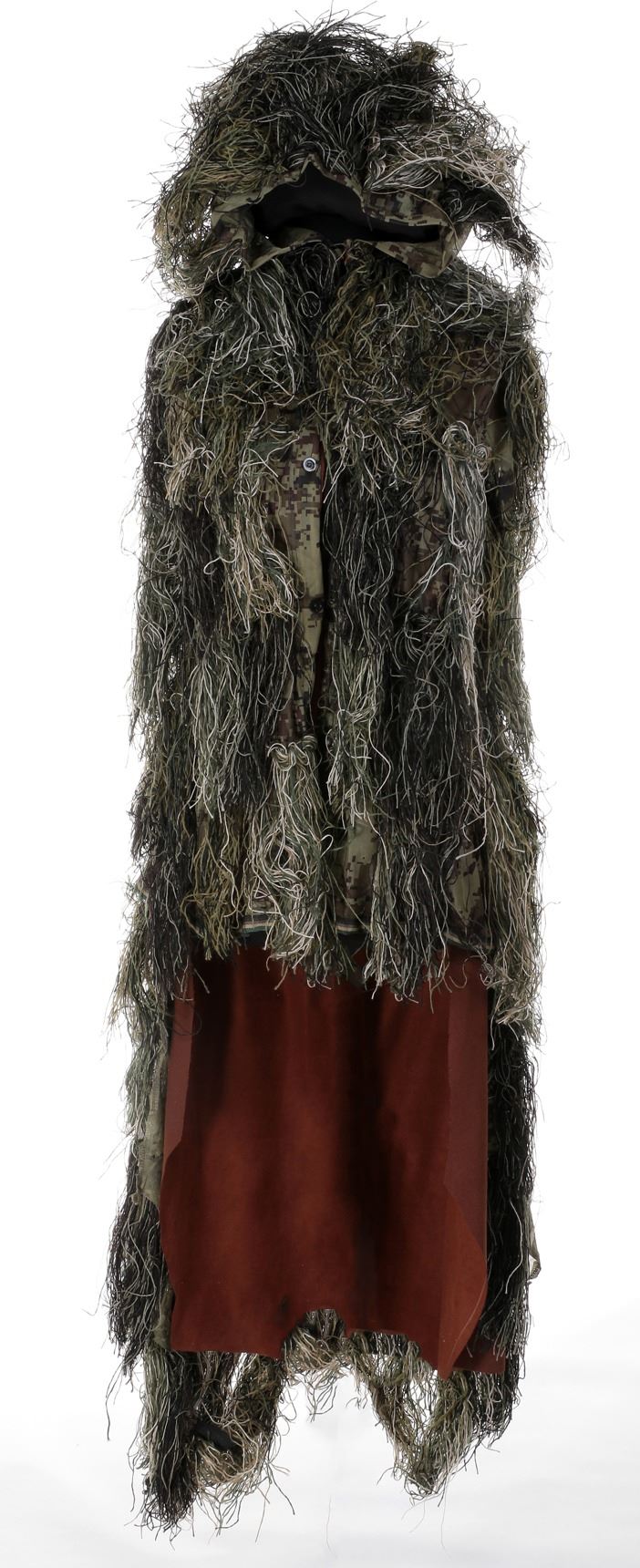 46. Emily Tennant "The Beast" Wendimoor ensemble with accessories from Dirk Gently's Holistic Detective Agency. (BBC America, 2016-2017) Fantasy hooded robe constructed of synthetic digital forest camouflage fabric over faux chamois lining and finished with tiered layers of shaggy, earth-toned yarn. Light tattering and studio distress. Also includes (15+) faux bone, claw, and tooth beads. Worn by the Beast, the wild girl who, incredibly, falls in love with Dirk Gently at first sight. Light production wear. In very good condition. Starting Bid: $25