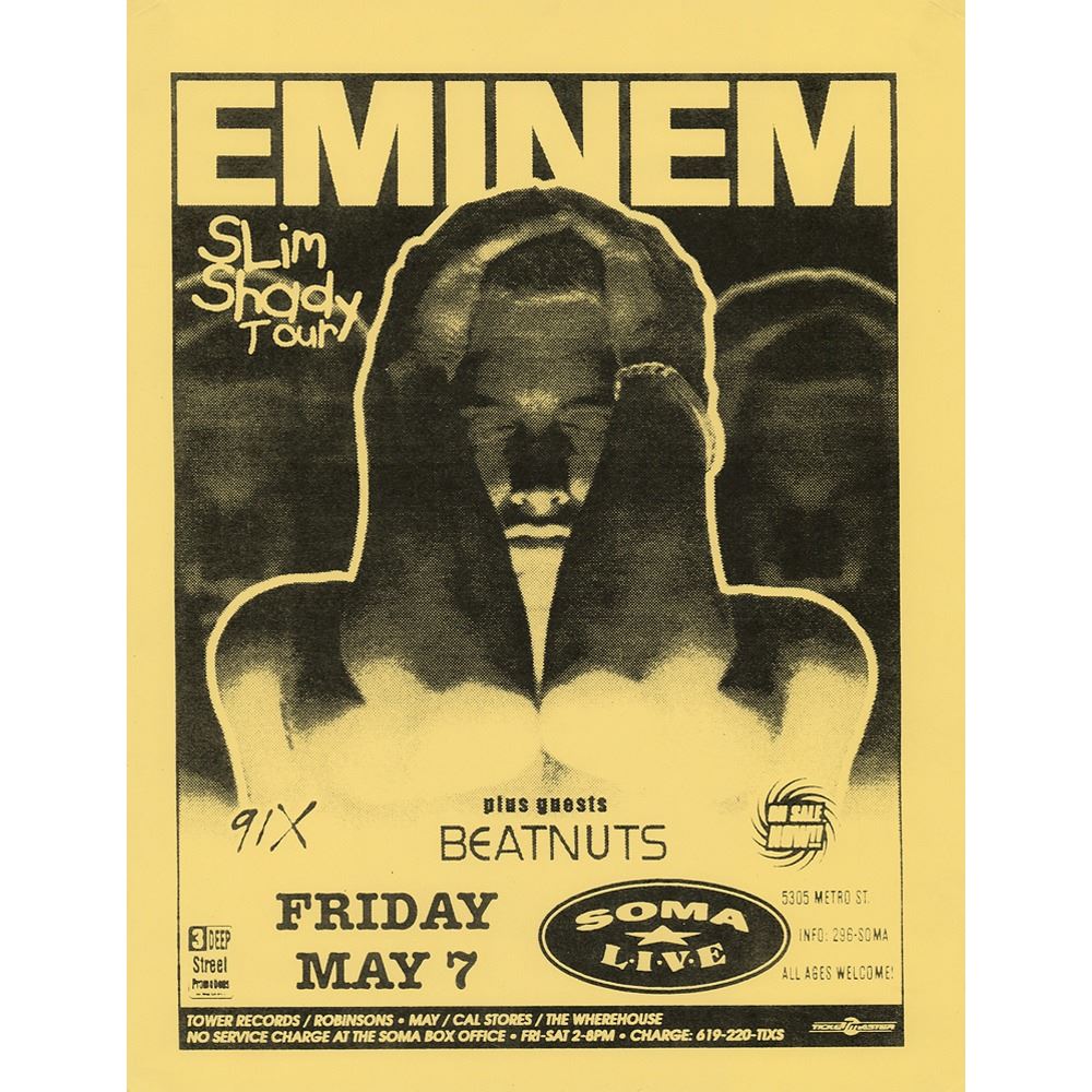 Original yellow 11 x 14.25 poster for an Eminem concert at Soma Live in San Diego, California, on May 7, 1999, as part of the Slim Shady Tour. The poster shows Eminem with his hands over his head and lists the special guest as Beatnuts. In fine condition.