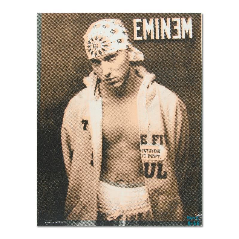 "Eminem" is a one-of-a-kind hand-pulled silkscreen on canvas by Ringo (Daniel Funes) - protege of Andy Warhol's apprentice, Steve Kaufman. This piece is hand signed by the artist and Includes Certificate of Authenticity. This piece comes from the Andy Warhol Legacy Series. Due to the nature of the canvas these, pieces will need to be mounted for framing. Measures approx. 12" x 16" (image).