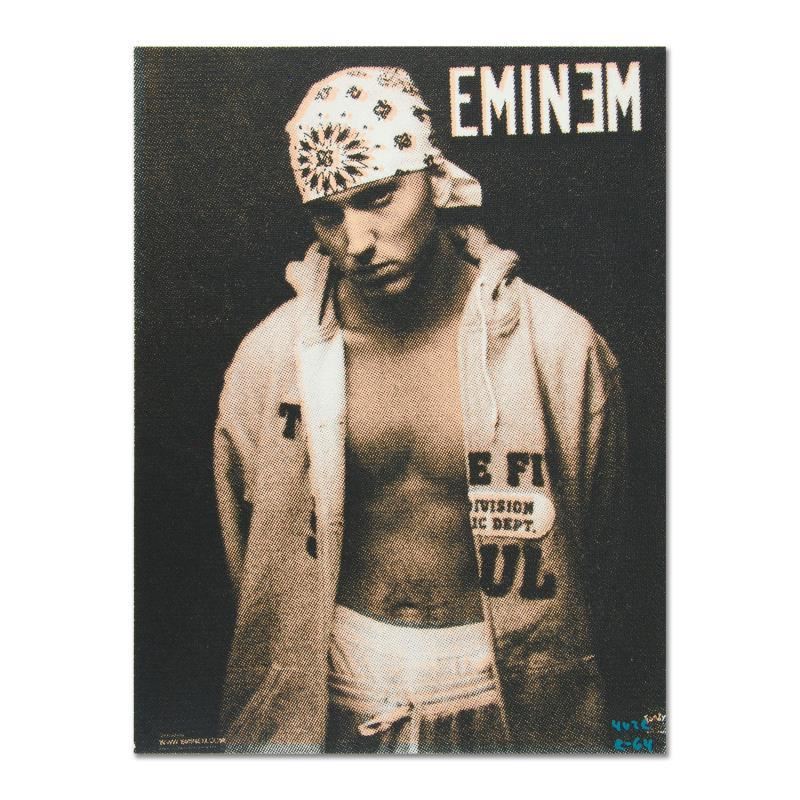 "Eminem" is a one-of-a-kind hand-pulled silkscreen on canvas by Ringo (Daniel Funes) - protege of Andy Warhol's apprentice, Steve Kaufman. This piece is hand signed by the artist and Includes Certificate of Authenticity. This piece comes from the Andy Warhol Legacy Series. Due to the nature of the canvas these, pieces will need to be mounted for framing. Measures approx. 12" x 16" (image).