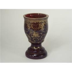 Fúvott színtelen üveg, rézrubin páccal festett henger alakú testén arany festéssel. Kopott. XIX sz. második fele, M.: 14 cm