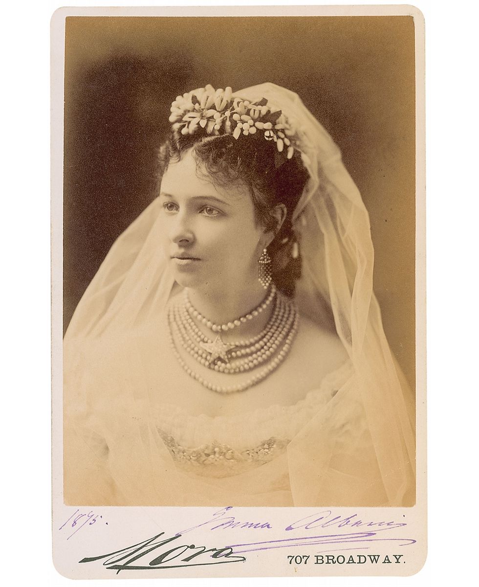 Renowned singer (1847–1930) who was the first Canadian to become an international opera star, performing for the likes of Queen Victoria, Kaiser Wilhelm I, and Czar Alexander II. Vintage 4.25 x 6.5 cabinet photo of Albani in a white dress and veil by Mora of New York, signed in the lower border in purple ink and dated 1875. In fine condition, with a bit of light rubbing to image and mounting remnants to reverse.
