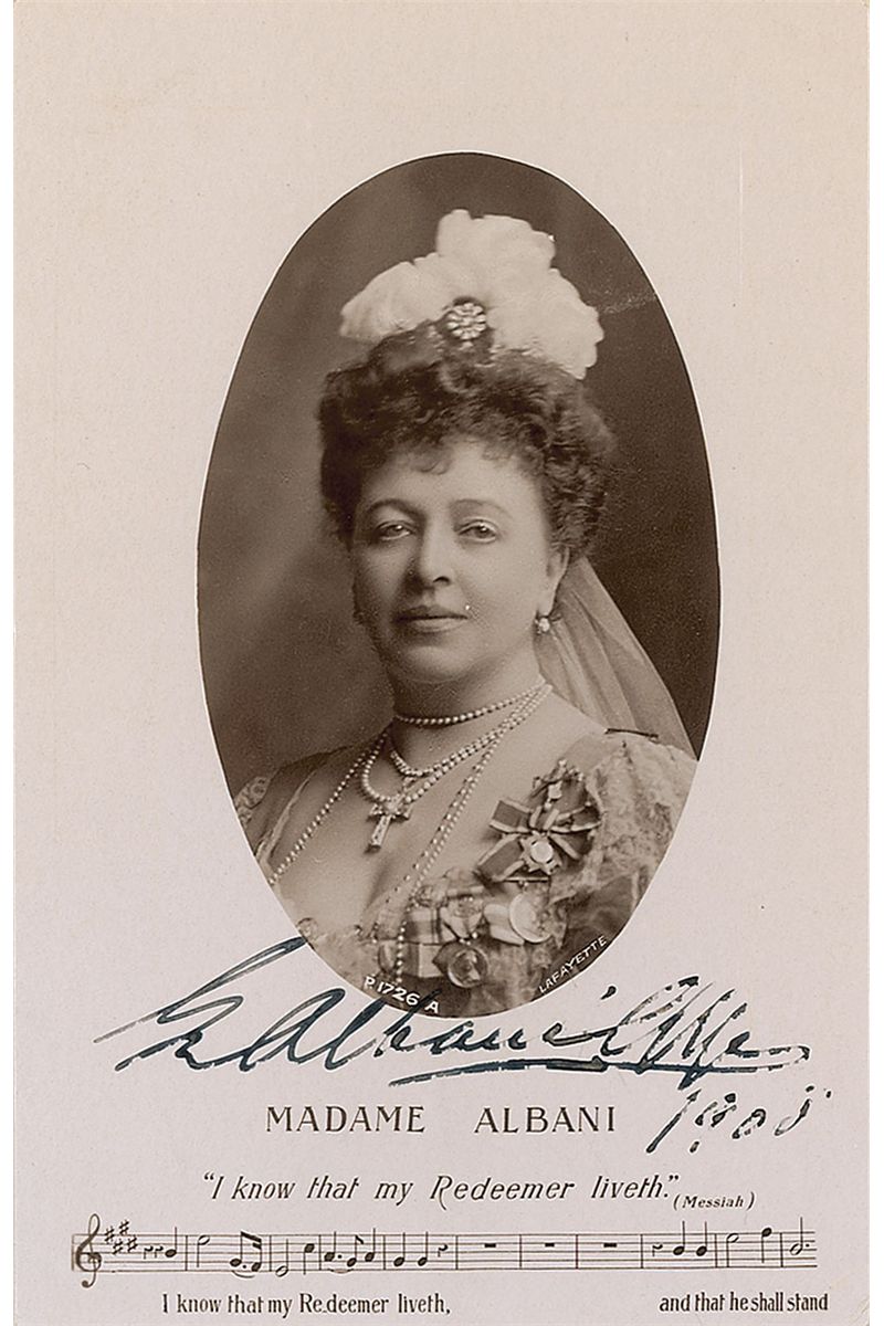 Renowned singer (1847–1930) who was the first Canadian to become an international opera star, performing for the likes of Queen Victoria, Kaiser Wilhelm I, and Czar Alexander II. Vintage glossy 3.5 x 5.25 real photo postcard featuring a portrait of Albani with a few bars of music below, signed in black ink, “E. Albani Gye, 1908.” In fine condition, with skipping to ink at end of signature.