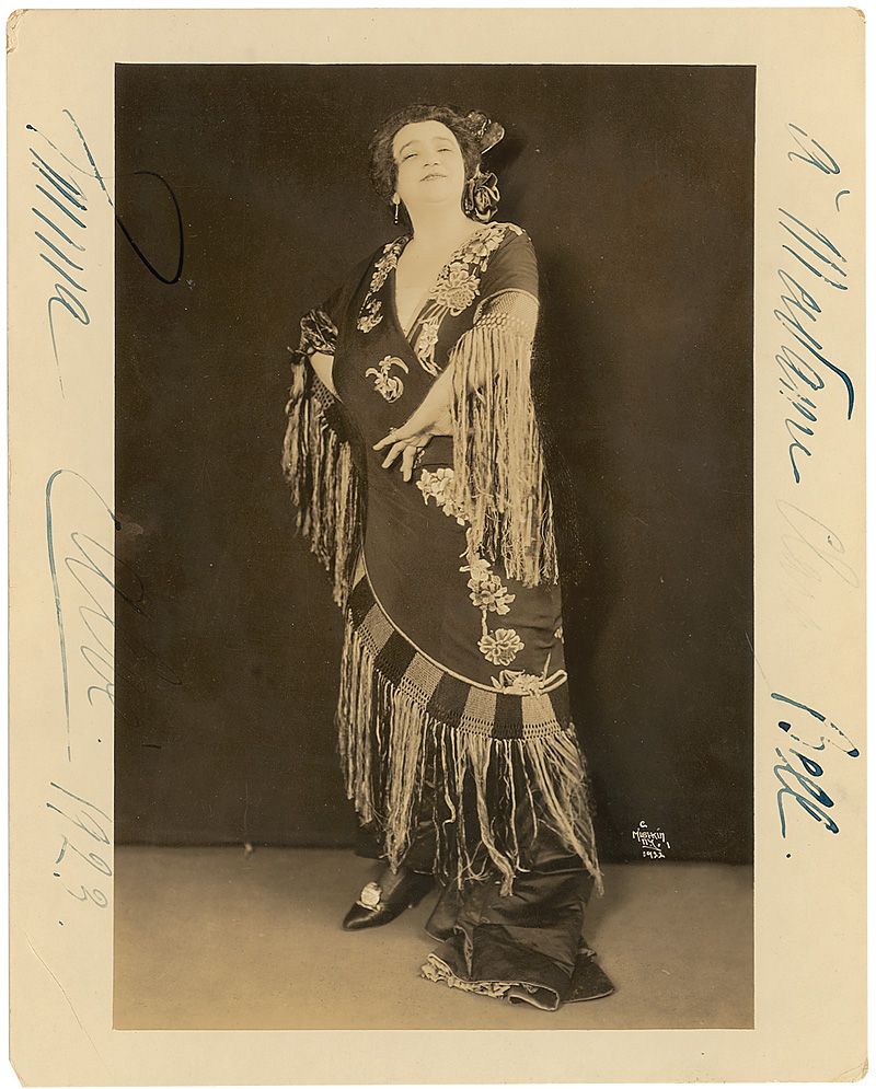 Vintage pearl-finish 8 x 10 publicity photo, signed and inscribed vertically in the borders in fountain pen “A Madam Clara Bell, Emma Calve 1923.” In very good condition, with a crease and light paper loss to the lower left corner, wear to the corner tips, a couple spots and light silvering to dark areas of the image, and some irregular adhesion to the inscription and signature.