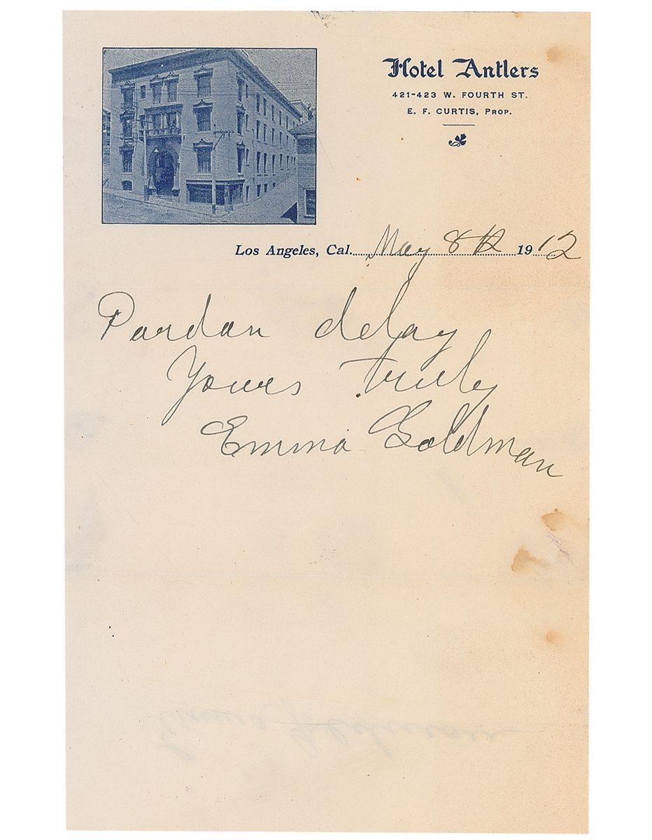 Anarchist known for her political activism, writing and speeches (1869-1940). ANS, one page, 5.25 x 8.25, Hotel Antlers letterhead, May 8, 1912. Brief note to an unidentified recipient. In full: “Pardon Delay. Yours truly.” In very good condition, with dampstaining and toning, mainly to right side, and a few scattered creases.