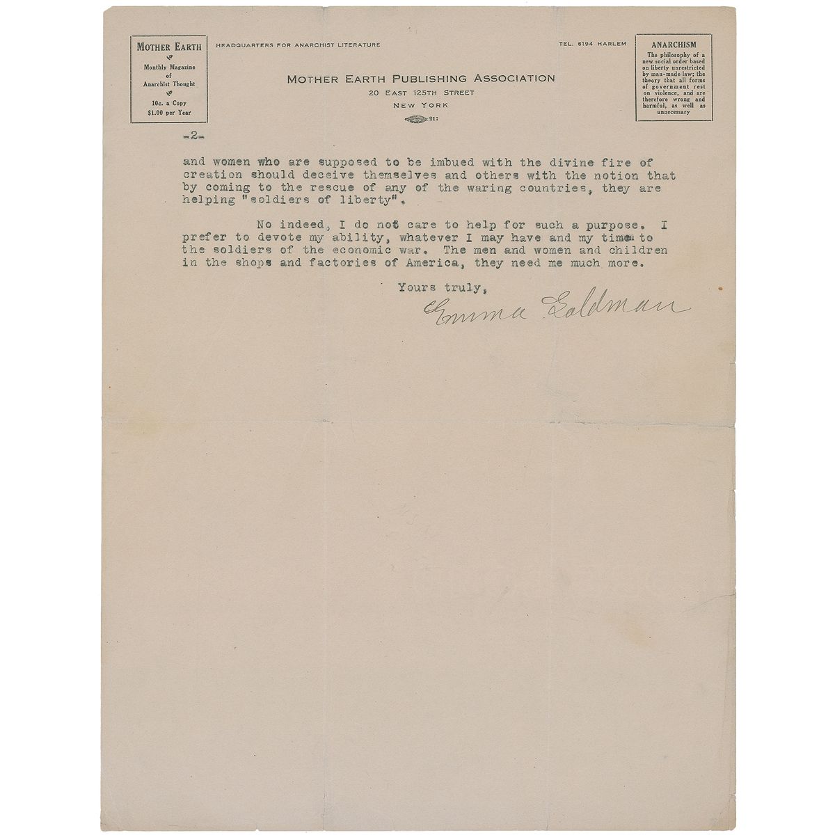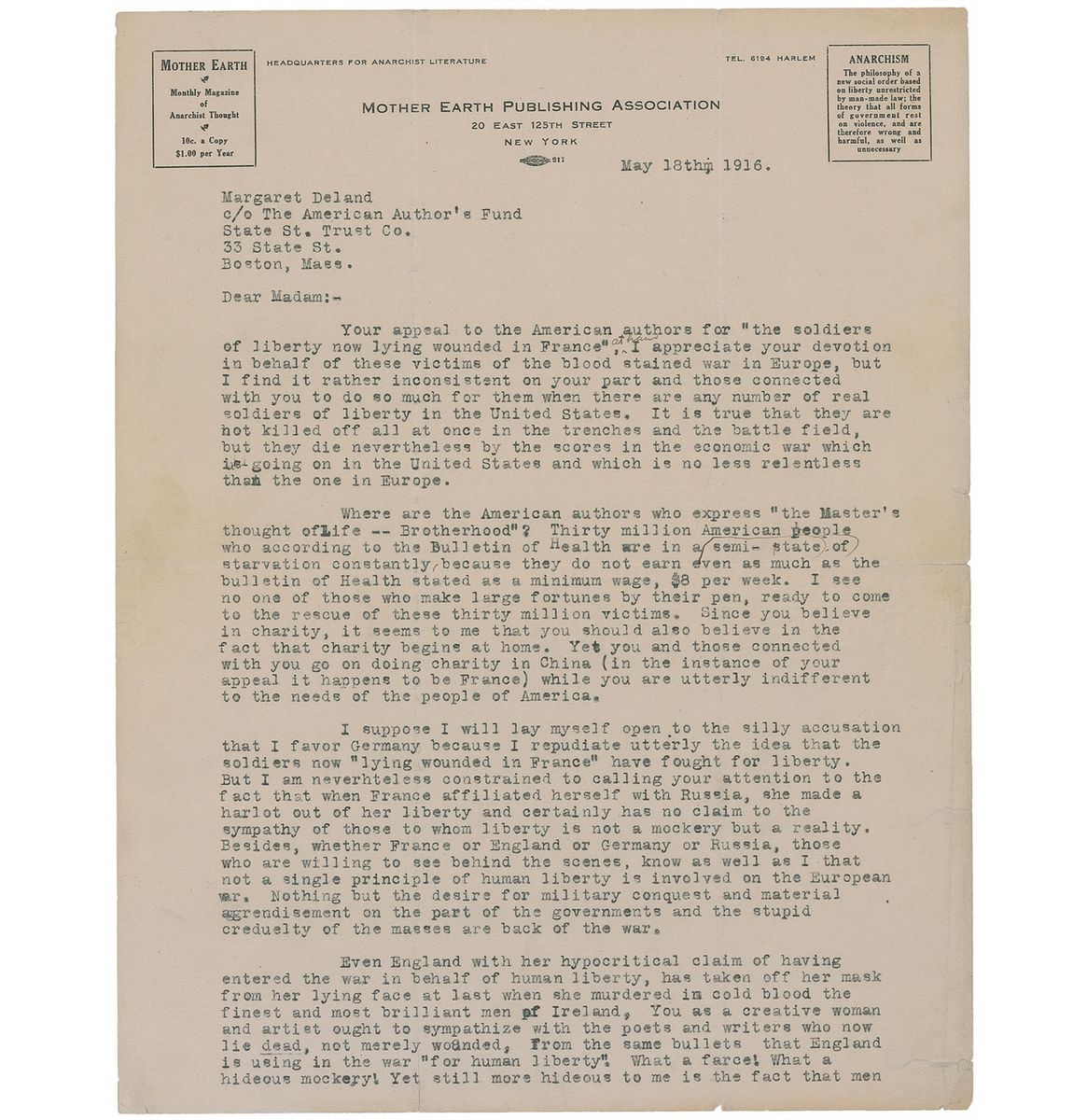 Scarce TLS, two pages, 8 x 10.75, Mother Earth Publishing Association letterhead, May 18, 1916. Letter to Margaret Deland of the American Author’s Fund, criticizing her support of Allied soldiers in World War I. In part: “I appreciate your devotion in behalf of these victims of the blood stained war in Europe, but I find it rather inconsistent on your part…to do so much for them when there are any number of real soldiers of liberty in the United States. It is true that they are not killed off at once in the trenches and the battle field, but they die nevertheless by the scores in the economic war which is going on in the United States…Thirty million American people…are in a semi-state of starvation…I see no one of those who make large fortunes by their pen, ready to come to the rescue of these thirty million victims...I suppose I will lay myself open to the silly accusation that I favor Germany because I repudiate utterly the idea that soldiers now ‘lying wounded in France’ have fought for liberty...those who are willing to see behind the scenes, know as well as I that not a single principle of human liberty is involved on the European war. Nothing but the desire for military conquest and material aggrendisement [sic] on the part of the governments and the stupid creduelty [sic] of the masses are back of the war...Even England with her hypocritical claim of having entered the war in behalf of human liberty, has taken off her mask from her lying face at last when she murdered in cold blood the finest and most brilliant men of Ireland. You as a creative woman and artist ought to sympathize with the poets and writers who now lie dead...What a farce! What a hideous mockery!” Intersecting folds (one vertical fold passing through a single letter of the signature), several small tape-repaired edge tears and separations, and scattered creases, otherwise fine condition. Goldman was the editor of Mother Earth, an anarchist journal that began to openly call for opposition to US entry into World War I in 1917. Congress passed the Espionage Act in June 1917, and according to the new laws Goldman’s advocacy against conscription made her guilty of obstructing the military draft. She was sentenced to two years in prison for her subversive actions, and later deported under the Anarchist Exclusion Act. An exceptional letter with direct relevance to Goldman’s anti-war efforts.