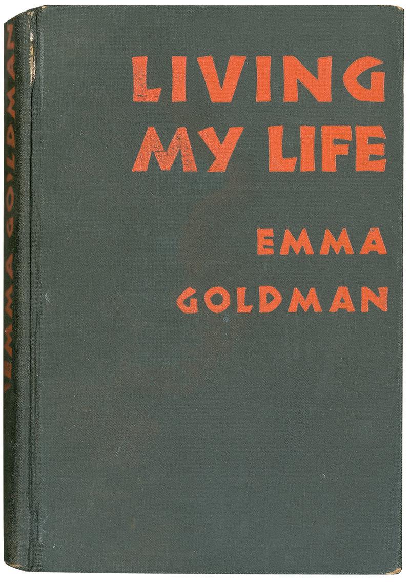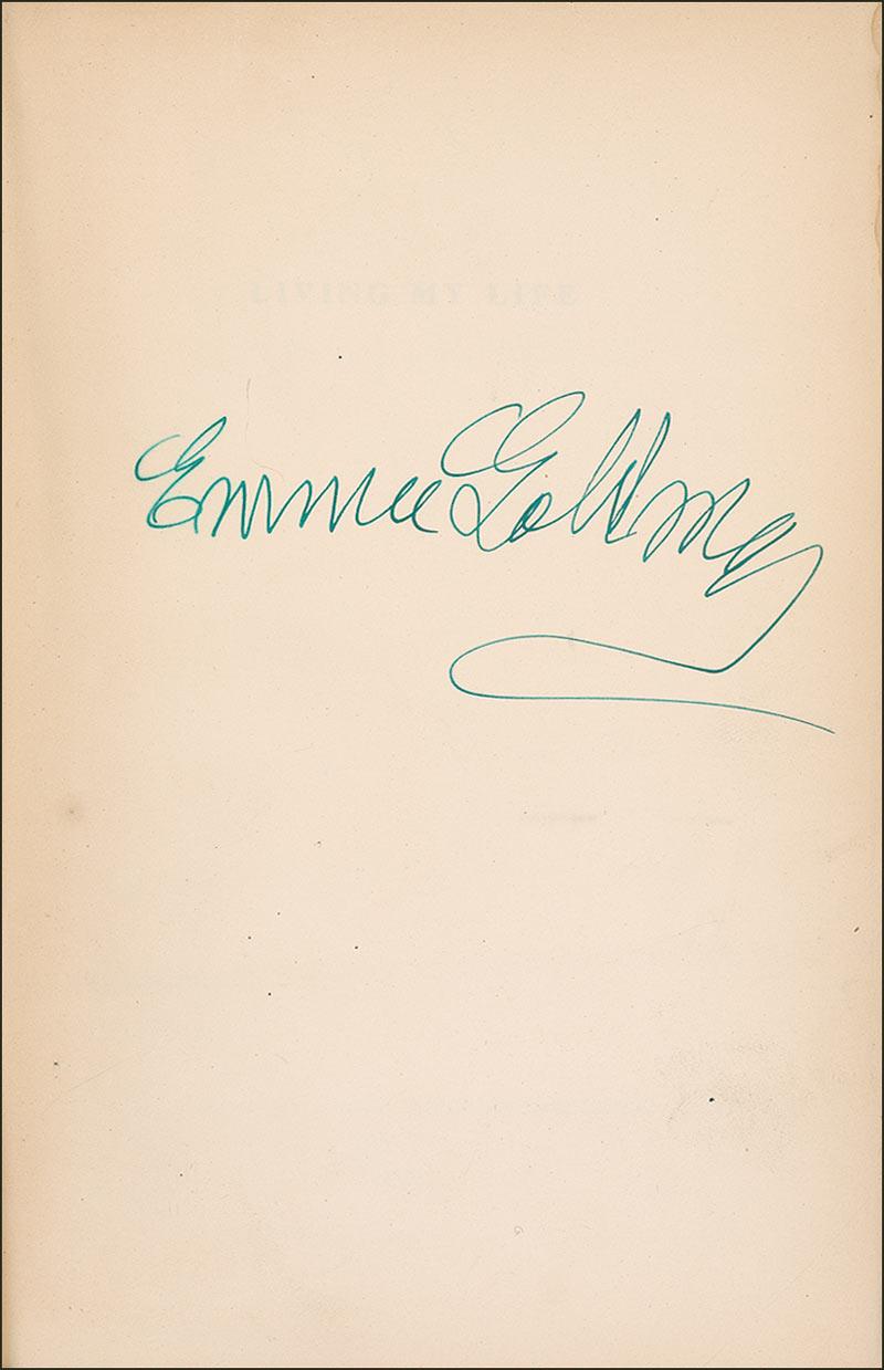 Anarchist known for her political activism, writing and speeches (1869-1940). Signed book: Living My Life. First edition, later printing. NY: Alfred A. Knopf, 1931. Hardcover, 6 x 9, 993 pages. Signed on the second free end page in green ink. In good condition, with owner’s bookplate affixed to inside front cover, scattered toning to opening pages, including signed page, partial separation along front hinge and opening pages, weak spine and binding, partial separation to front cover, and wear and fraying to spine.