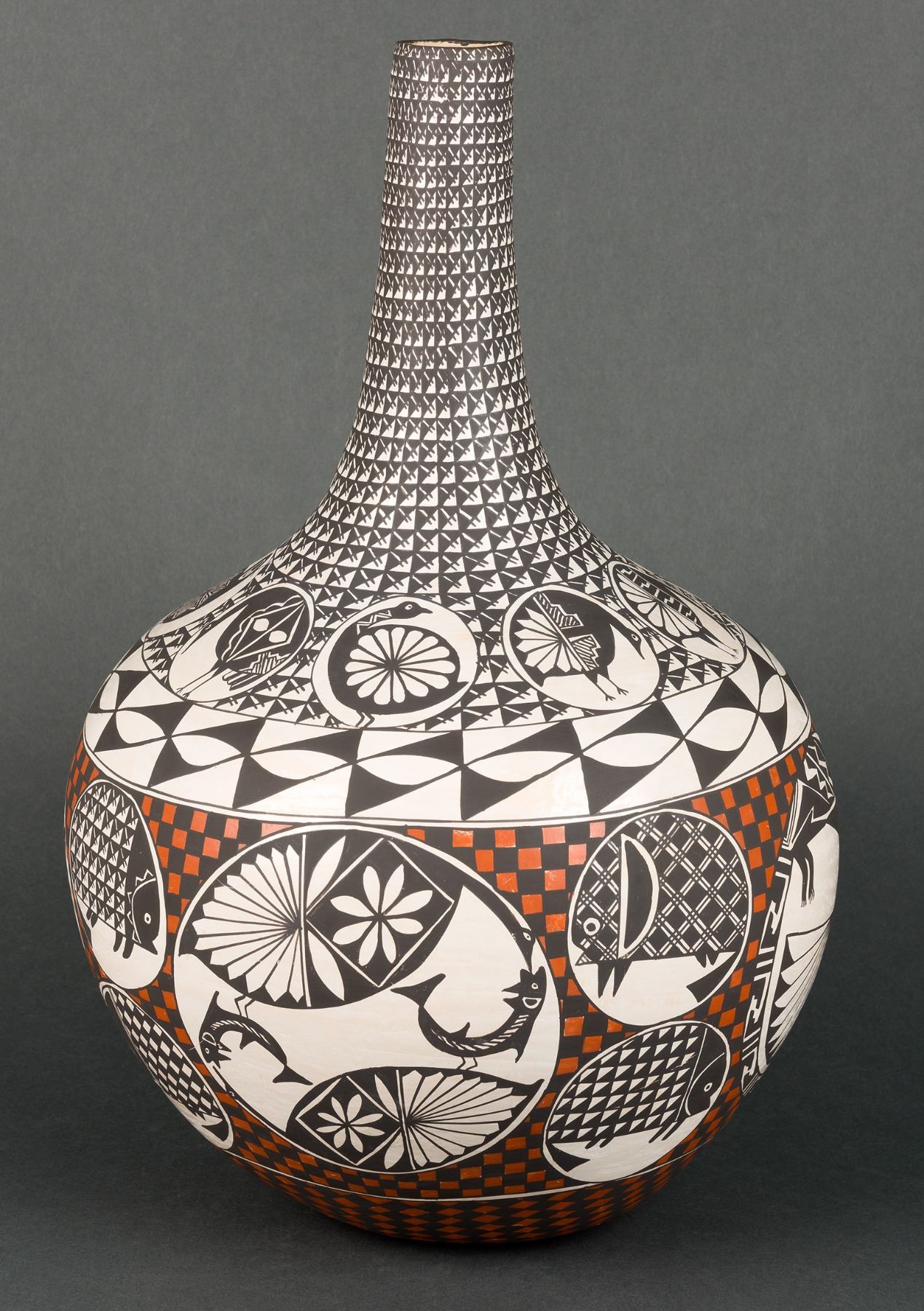 Condition details: This piece is in very good condition. Close inspection with the unaided eye reveals a few very minor blemishes along the shoulder and one tiny speck of missing pigment located in one of the orange squares. Inspection under UV light does not reveal any signs of restoration. The underside shows very little wear.
