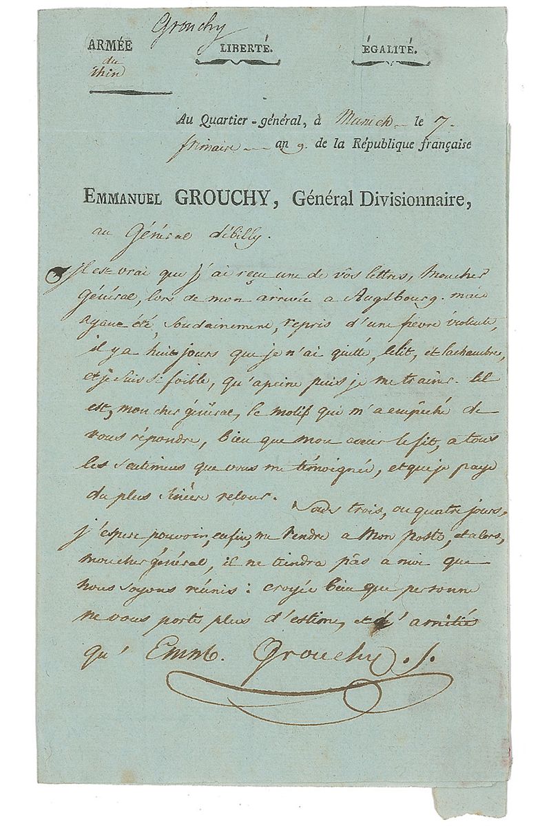 French general and marshall (1766–1847). ALS signed “Emml. Grouchy,” one page, 4.5 x 7.5, personal letterhead, November 28, 1801. Letter to General Jean-Louis Debilly, explaining that ill health has prevented him from replying to Debilly’s letters. In par