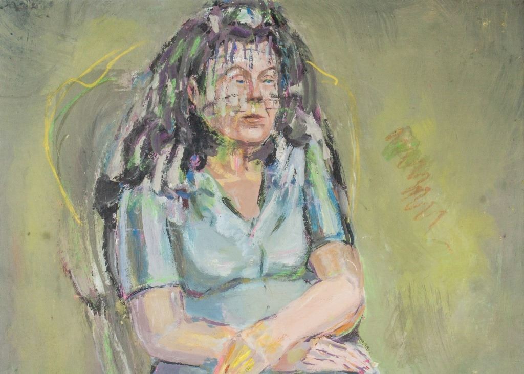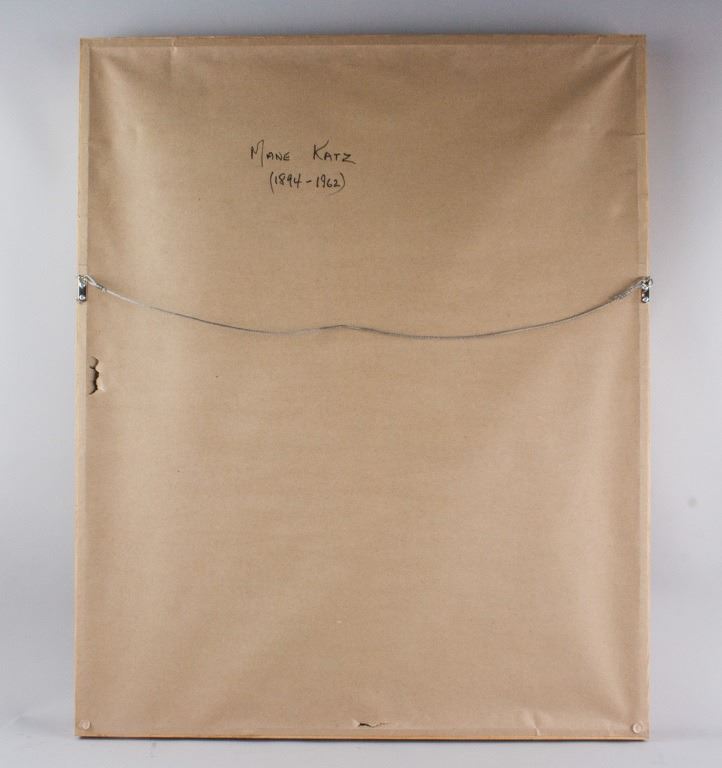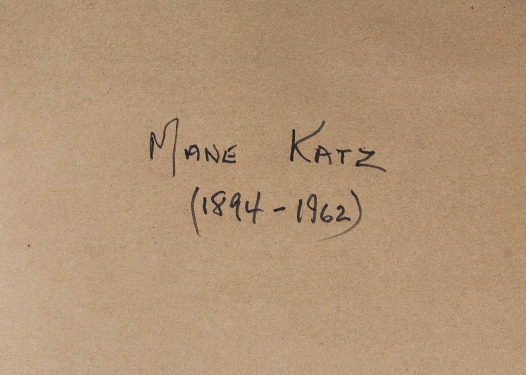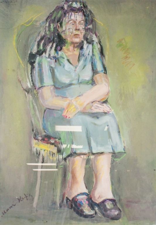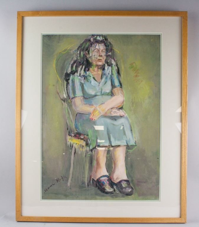 Gouache on paper, framed. Featuring a seated woman on chair. The woman, hunched over in a white chair with supporting oversized backside has her hands neatly crossed over one another. Seated on a cushion and wearing slippers with a cleanly hemmed dress hanging over her knees she looks nervously ahead into the distance. Signed Mane-Katz on the lower left corner. Attributed to Emmanuel Mane-Katz (1894-1962, Litvak). 66 x 46 cm (26 x 18 inches). Framed size: 84 x 68 cm (33.1 x 26.8 inches). PROVENANCE: Southern Ontario estate
