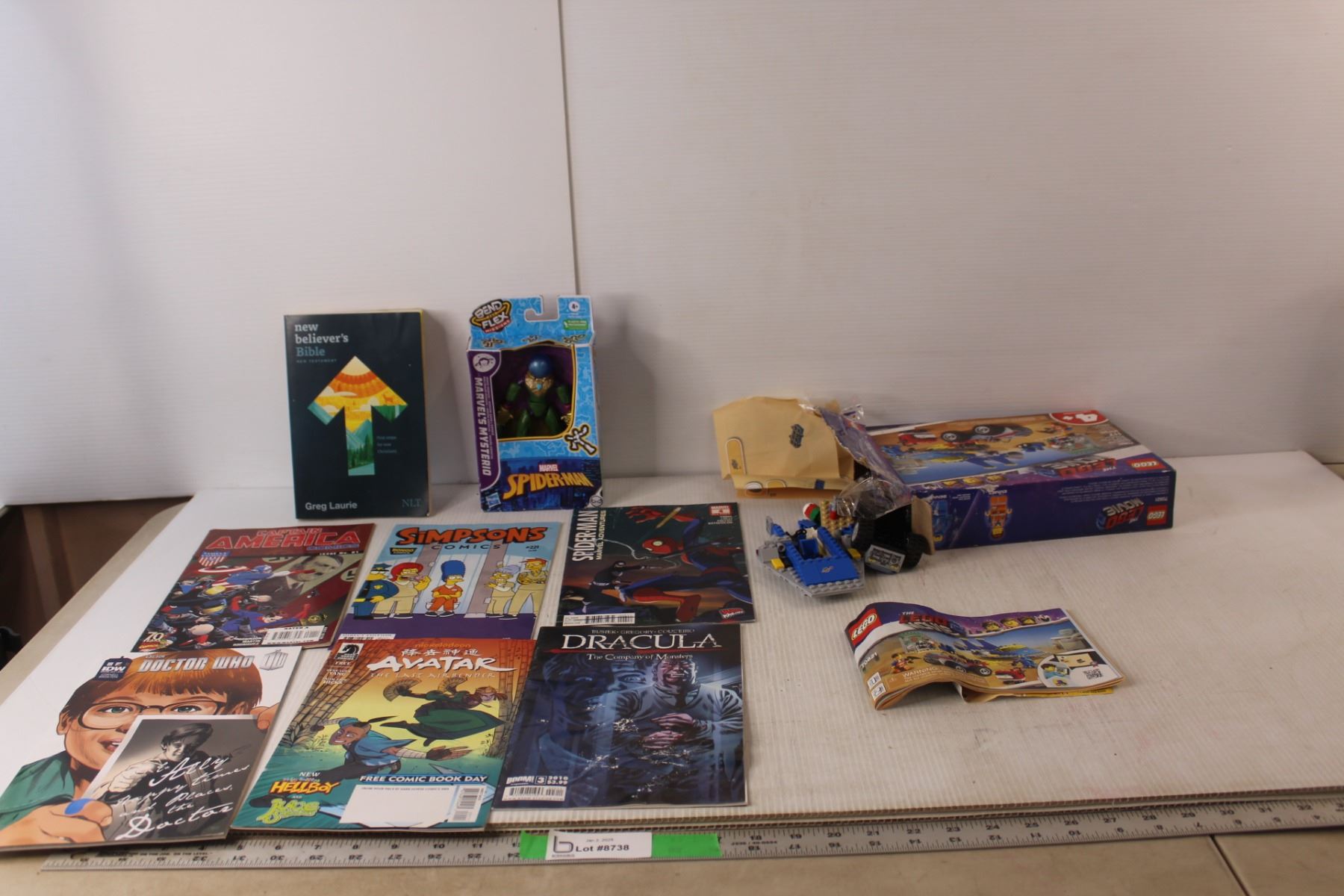 Emmet & Benny's Build & Fix Workshop' Lego Toy Set- As Is, (6) Comics- Spiderman, Dracula, The Simpsons, The Last Airbender, Captain America, Doctor Who, Bible, Mysterio Figurine