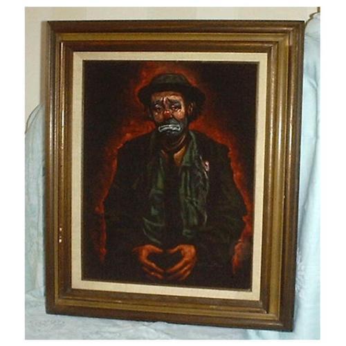 An oil painting on black velvet of Emmet Kelly, one of the greatest circus clowns that ever lived.<p> This picture was purchased at Circus World, on the back of the picture is a Circus World, Ring Master Club business card. <p>The artwork is signed by William Mix and has been masterfully painted. <p> The picture is in a brown,carved and detailed, wood frame and is ready to hang. <p> Measurements are 18" tall by 14" wide. <p> Emmet is in full clown makeup. He is wearing a dark green suit with a tie around his bare neck. Emmet's entire body has a red aura illuminating around him.<p>A handsome tribute to a special Clown.<p>Shipping includes foam board packing and insurance.