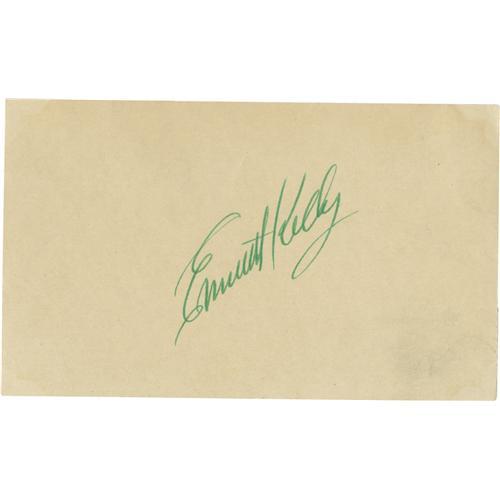 <B>Emmett Kelly Autograph.</B></I> A 3" x 5" notecard signed by the famous circus performer in green ink, in Very Fine condition with mild tanning and a little soiling.<BR><BR><b>Shipping:</b> Flat Material, Small (<a target="_blank" href="http://www.heritageauctions.com/common/shipping.php">view shipping information</a>) <BR><BR><B>Important n