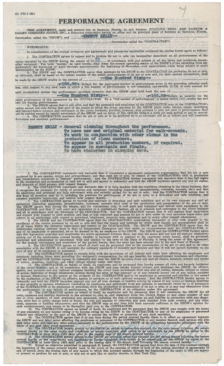 DS, signed “Emmett Kelly,” one page both sides, 9 x 15, March 7, 1953. Agreement between the Ringling Bros. and Kelly for him to appear in their shows, offering specifics of the positions including: “General clowning throughout the performance,” “To work in conjunction with other clowns in the production of clown numbers,” “To appear in all production numbers, if necessary,” and “To appear in spectacle and finale.” Signed at the conclusion in fountain pen by both Kelly and John Ringling North. In very good to fine condition.