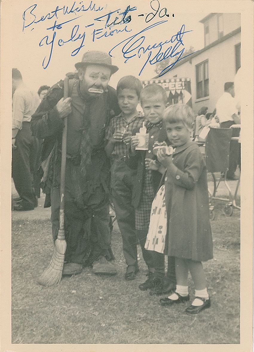 Beloved American entertainer (1898–1979), best known as the clown 'Weary Willie.' Vintage matte-finish 5 x 7 candid photo of Kelly posing with three children, signed and inscribed in blue ballpoint, "Best wishes to Yoly - Tito - Ja, From, Emmett Kelly.” In fine condition.