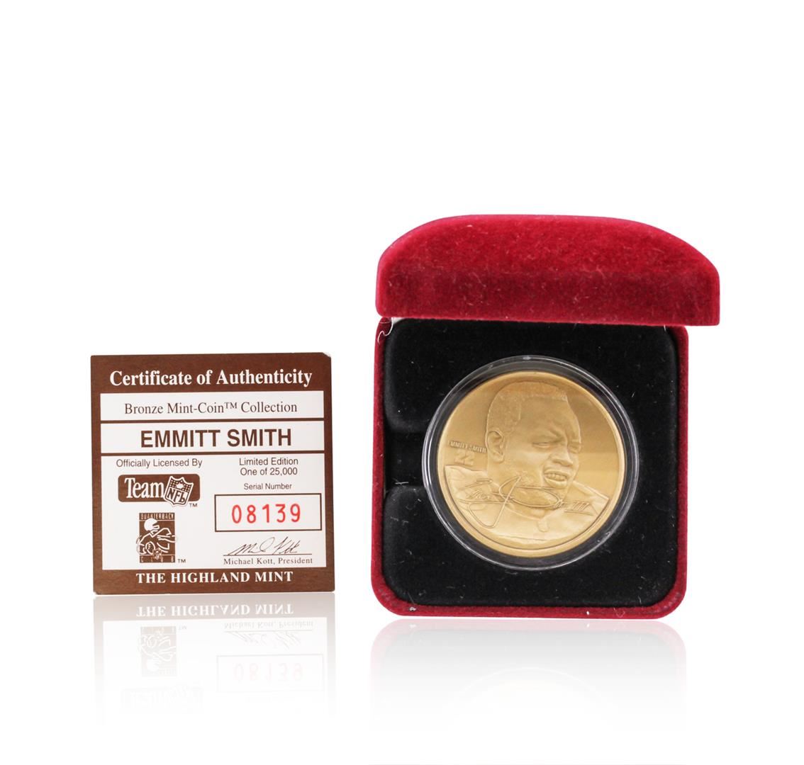 This beautiful bronze mint medallion is of Emmitt Smith, National Football Leagues All-Time Dallas Cowboys rushing leader. This coin is minted by The Highland Mint, comes with a Certificate of Authenticity and is set in a beautiful red case.