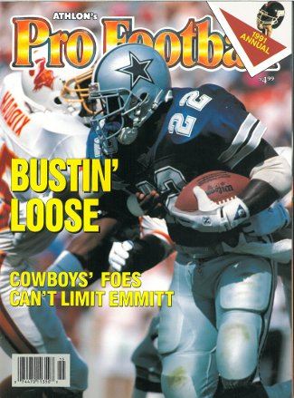 This is an Athlon Sports 1991 Pro Football Magazine with Dallas Cowboys Runningback Emmitt Smith on the cover. This Preview has team analysis, predictions, lineups, rosters and more for the 1991 Season