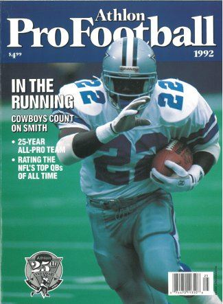 This is an Athlon Sports 1992 Pro Football Magazine with Dallas Cowboys Hall of Fame Running back Emmitt Smith on the cover. This Preview has team analysis, predictions, lineups, rosters and more for the 1992 Season