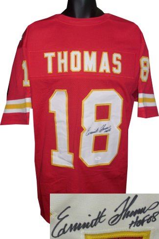 Emmitt Thomas played for the American Football League's Kansas City Chiefs from 1966 to 1969, and then for the Chiefs in the NFL from 1970 to 1978. He owns the Chiefs all-time interception record with 58, which places him ninth on pro football's all-time list. Thomas was elected to the NFL's Pro Football Hall of Fame after being nominated by the Seniors Committee in 2008. Emmitt Thomas has hand signed this Kansas City Chiefs Red Prostyle Jersey with HOF 08 inscription. JSA Hologram and Certificate of Authenticity.
