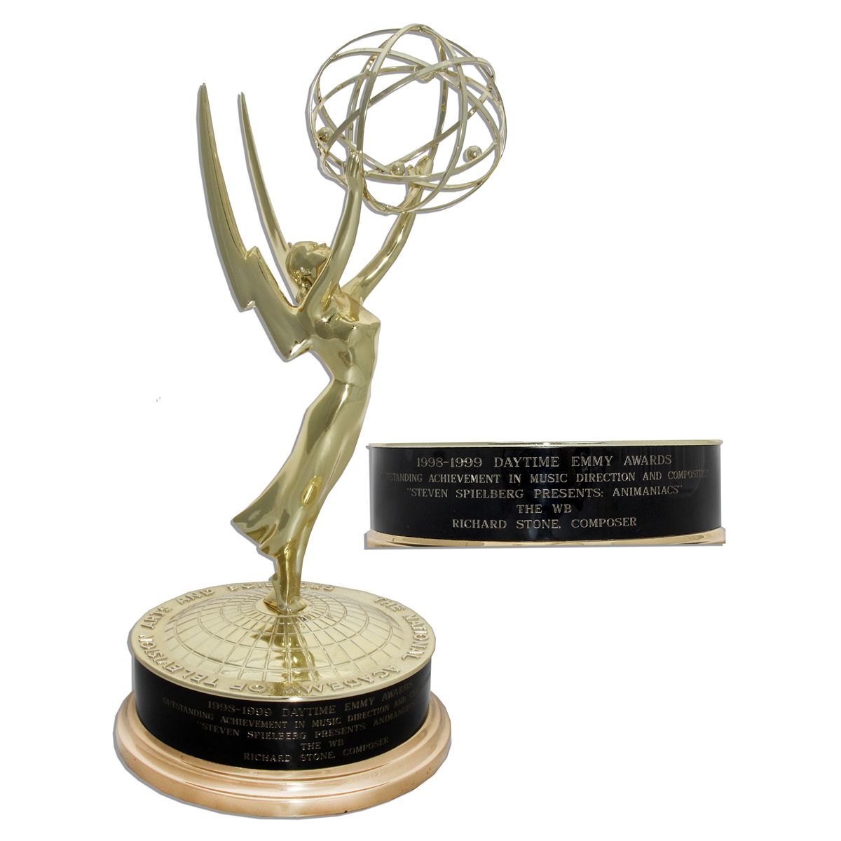 Emmy Award statue presented at the 1998-1999 Daytime Emmy's. This award was presented to composer Richard Stone for Outstanding Achievement in Music Direction and Composition for the WB children's cartoon, ''Steven Spielberg Presents: Animaniacs''. The Academy of Television Arts and Sciences was formed in 1946 and began recognizing excellence with the annual award ceremony in 1949. The iconic winged woman holding an atom is made of metal and stands on the slightly convex, grid-lined surface of a round metal base. The base's flat perimeter reads ''The National Academy of Television Arts & Sciences''. Front section is engraved with 5 lines naming the award, its category and recipient. Measures 15.5'' in total height with a 7.5'' diameter base. Weighs 4 lbs., 4.75 oz. Black felt lining is affixed to underside. Very minor tarnishing to base, else fine.