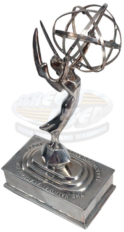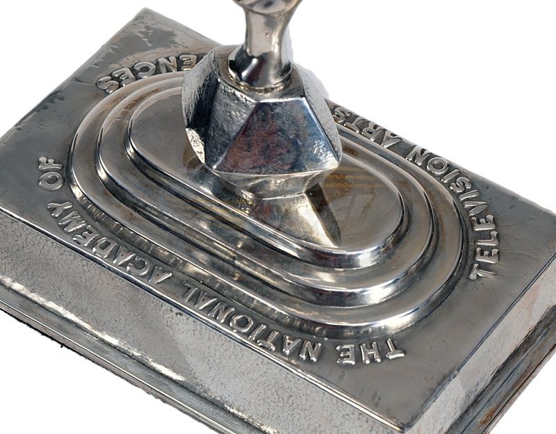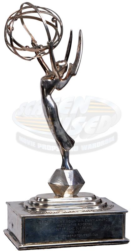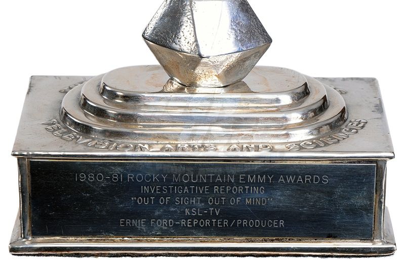 1980-81 Emmy award statuette from the Rocky Mountain Southwest Chapter of the National Academy of Television Arts and Sciences. Presented to Utah journalist Ernie Ford. Plaque reads: ''1980-81 Rocky Mountain Emmy Awards / Investigative Reporting / 'Out of Sight, Out of Mind' / KSL-TV / Ernie Ford - Reporter/Producer''. ''The National Academy of Television Arts and Sciences'' is embossed on top of the base. Statuette stands 11.25'' high including the base, which measures 5.25'' x 3''. Award weighs 3.5 pounds. Overall very good. Refurbished.