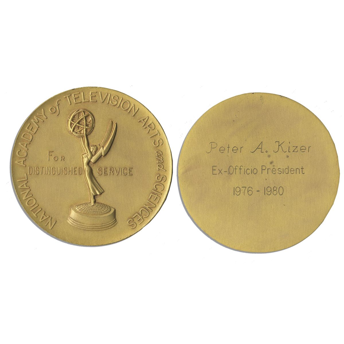Medal from the Emmy Awards governing body, the Academy of Television Arts & Sciences. Medal is cast with the iconic Emmy figure, circumscribed with the name of the Academy and dedication, ''For / Distinguished Service''. Plain reverse side is engraved, ''Peter A. Kizer / Ex-Officio President / 1976-1980''. Solid medal made of an unmarked metal, likely brass or gold tone bronze, measures 3'' in diameter. Weighs 6 ounces or 172 grams. Scattered minor abrasions to rim, else near fine. Housed in original walnut hinged case.