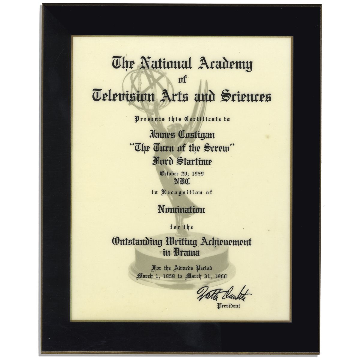 Emmy Award nomination certificate from 1959. National Academy of Television Arts and Sciences certificate is issued to James Costigan in the category of ''Outstanding Writing Achievement in Drama'' for ''The Turn of the Screw''. Costigan's adaptation of the ghost story novella by Henry James aired on NBC's mystery series ''Startime''. Ingrid Bergman won the Best Actress Emmy for her performance in the thriller. Nomination for the most prestigious award in television is signed in print by Walter Cronkite as President of the Academy. Inlaid to a wooden plaque with glossy finish to an overall size of 9'' x 10.75''. Long narrow chip to bottom edge of wood backing, else near fine.