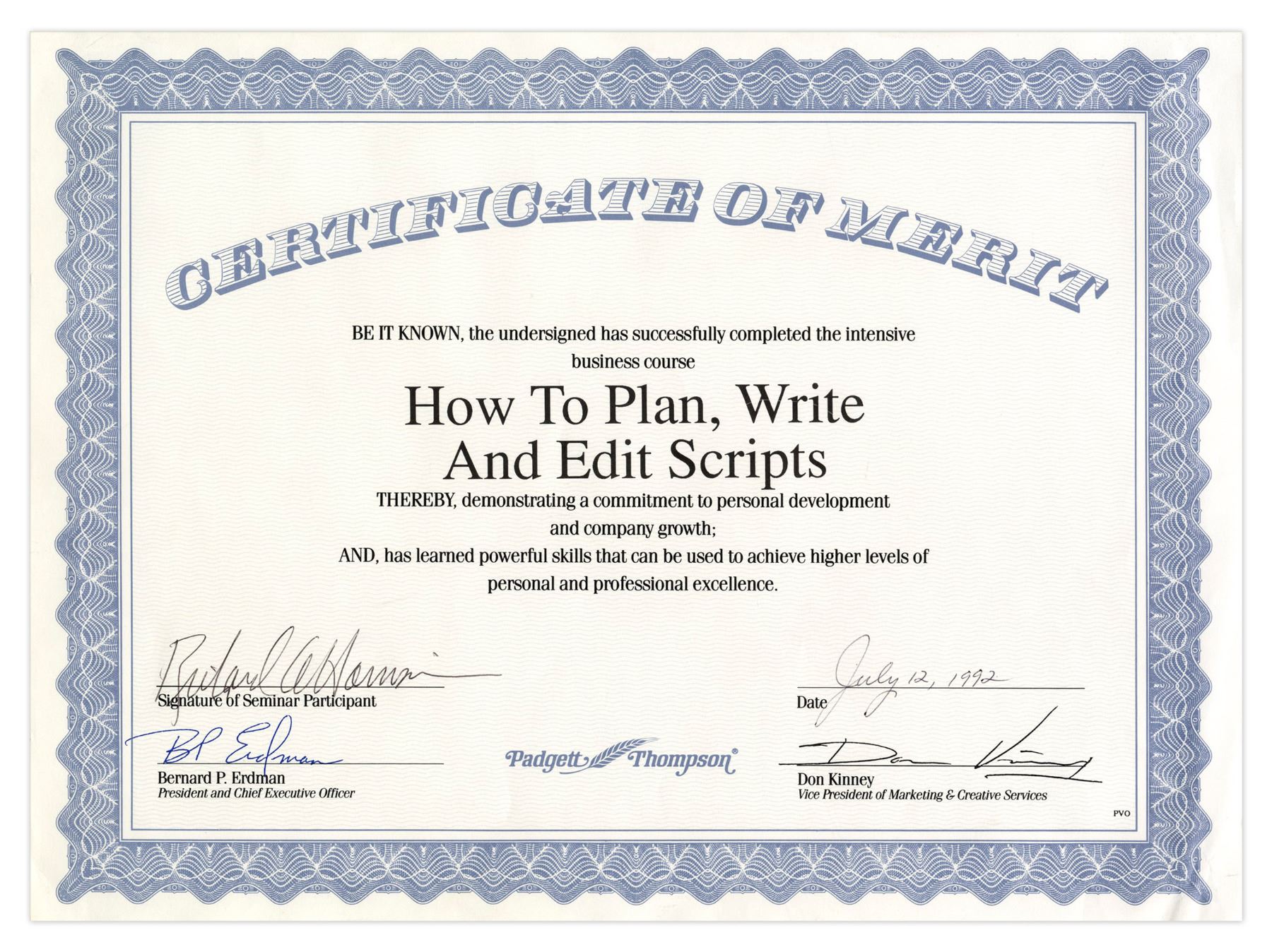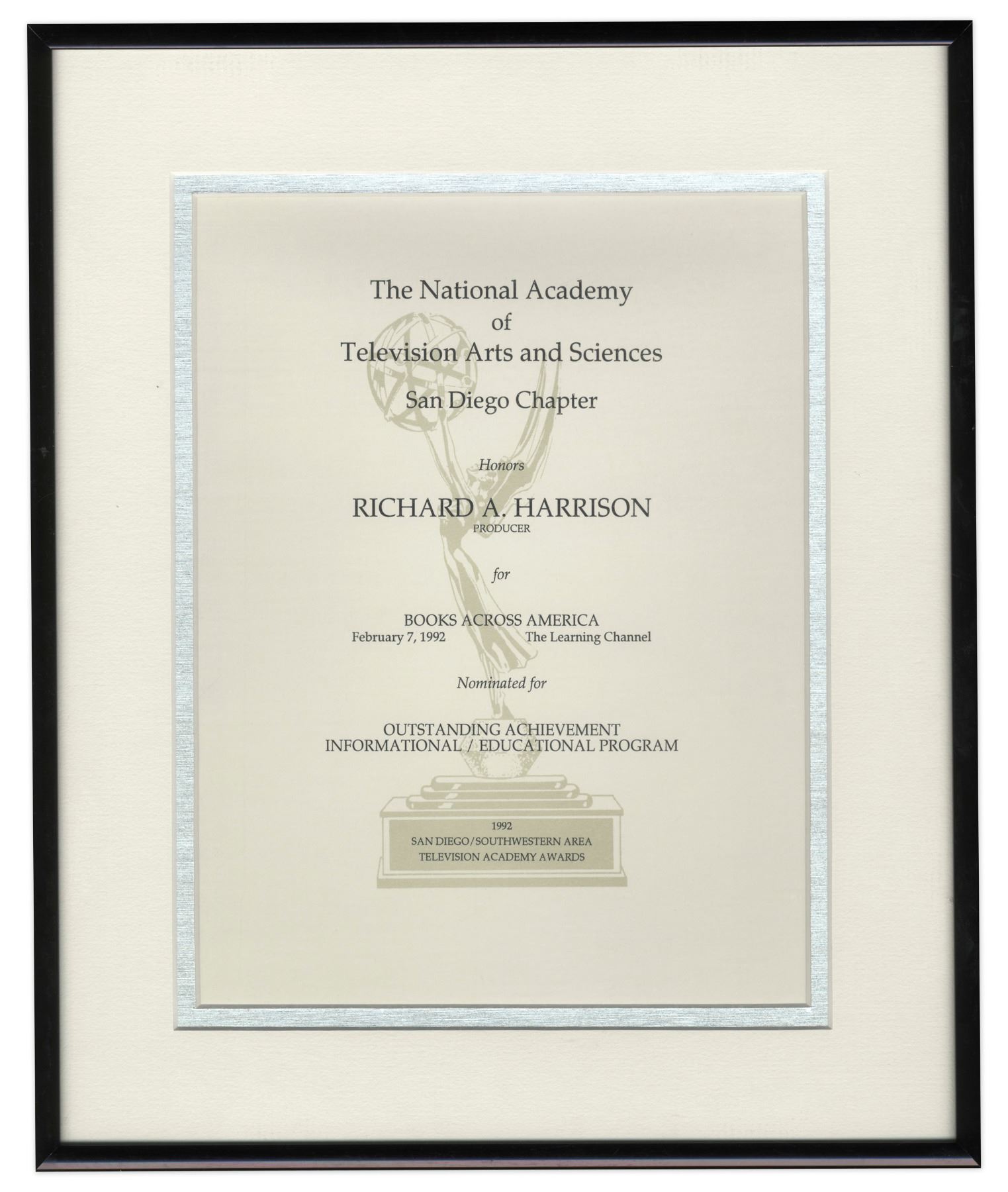 Emmy certificate, nominating producer Richard Harrison's ''Books Across America'' for Outstanding Achievement in Informational/Educational programming. Dated 7 February 1992, the 10.5'' x 12'' framed certificate is near fine. Lot also includes a business certificate awarded to Richard Harrison.
