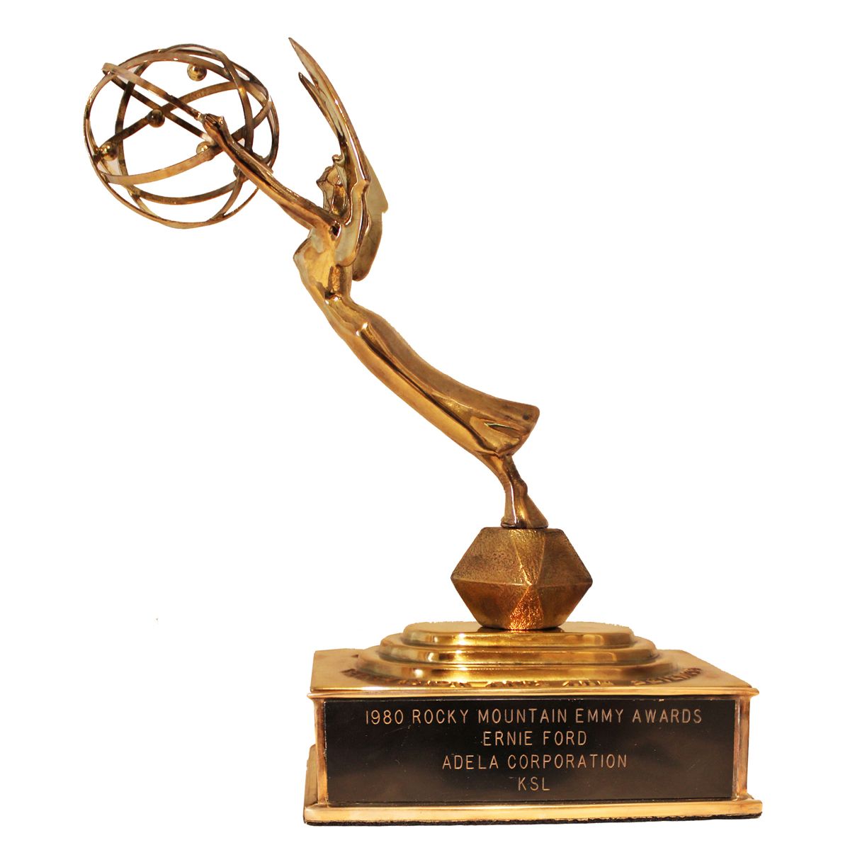 1980 Emmy award from the Academy of Television Arts and Sciences. Plaque reads, ''1980 Rocky Mountain Emmy Awards / Ernie Ford / Adela Corporation / KSL''. Statue stands 9.75'' high including the base, which measures 5'' x 3''. Award weighs 3.8 pounds. A very impressive statue with only light tarnishing to the gold-bronze finish. Emmy statues are unusually rare. Refurbished.