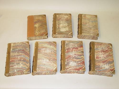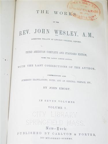 Emory, John [ Numerous translations, Notes and Preface by]. The Works of the Rev. John Wesley - 7 Volumes. New York: Carlton & Porter, 8vo - over 7¾" - 9¾" tall. Hard Cover. Ex-Library. Fair to Poor Condition. Third American Complete and Standard Edition, from the Latest London Edition, With the Last Corrections by the Author. RARE AS A COMPLETE SET. Bound in 3/4 leather leather & marbled paper, raised bands on blind stamped spine, marbled endpapers, marbled page edges all around. Cover rubbed with edge/corner wear/tear, edge damp mark in some volumes, one backstrip is cloth tape, one lacks back cover, one lacks most of backstrip with chips to others. BINDINGS TIGHT.