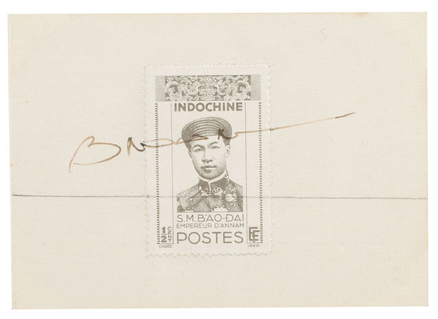 Vintage fountain pen signature of Emperor Bao-Dai over a postage stamp from French Indo-China affixed to an off-white 3.5 x 2.5 card. In fine condition.