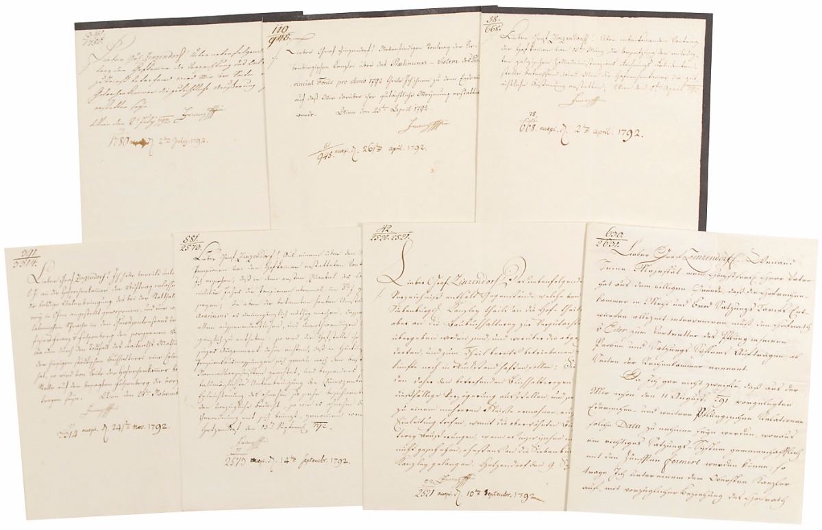 The last Holy Roman Emperor (1768–1835) who ruled from 1792–1806, when he dissolved the empire, and became the first Emperor of Austria. Collection of seven untranslated LSs in German, totaling eight pages, 7.5 x 9, dated April–November 1792. All are official letters to Count Karl von Zinzendorf und Pottendorf, who served the government of Austria in a variety of capacities, including as governor of Trieste, and rose to high rank at the Habsburg court. In overall fine condition.
