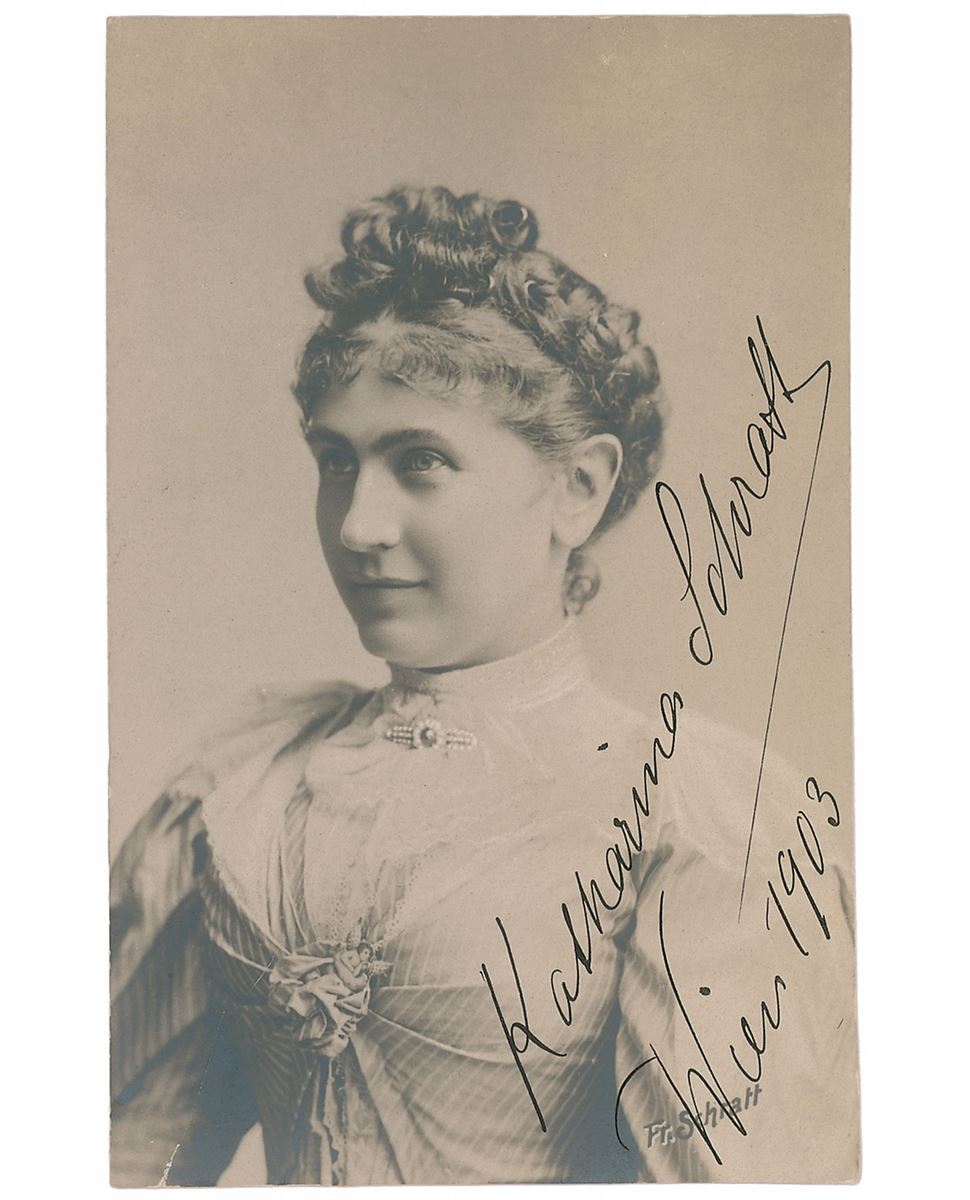 Austrian actress (1853–1940) who became ‘the uncrowned Empress of Austria’ as a confidante of Emperor Franz Joseph. Choice 3.25 x 5.25 postcard photo of the lovely actress, signed in black ink, “Katharina Schratt, Wien 1903.” In fine condition.