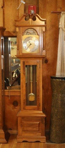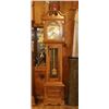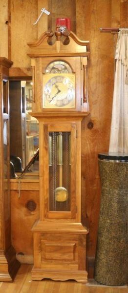Beautiful clock with oak cabinet that has a gold and silver tone face with rotating forest scene. Scroll and urn carved top with a lower glass front cabinet that holds three brass chimes and pendulum. Measures 39 1/2"l x 82 1/2"h x 12 3/4"w. Good condition.