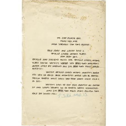 <B>Emperor Haile Selassie I of Ethiopia Document Signed</B></I>, one page, 9.5" x 14.25", Addis Ababa, "<I>the fourth year of our reign</B></I> [1933]", in Amharic. The document has an embossed seal of the Kingdom of Ethiopia and a few small insect holes. Foxing and a central fold. A few small tears along the edges where the document was removed from a binding, else very good. The document is addressed to Tiburcio Carias Andino congratulating him on becoming Constitutional President of the Republic of Honduras. Haile Selassie's full title was "His Imperial Majesty Haile Selassie I, Conquering Lion of the Tribe of Judah, King of Kings of Ethiopia and Elect of God". He is also considered to be the religious symbol for God incarnate among the Rastafari movement.<BR><BR><b>Shipping:</b> Flat Material, Small (<a target="_blank" href="http://www.heritageauctions.com/common/shipping.php">view shipping information</a>)