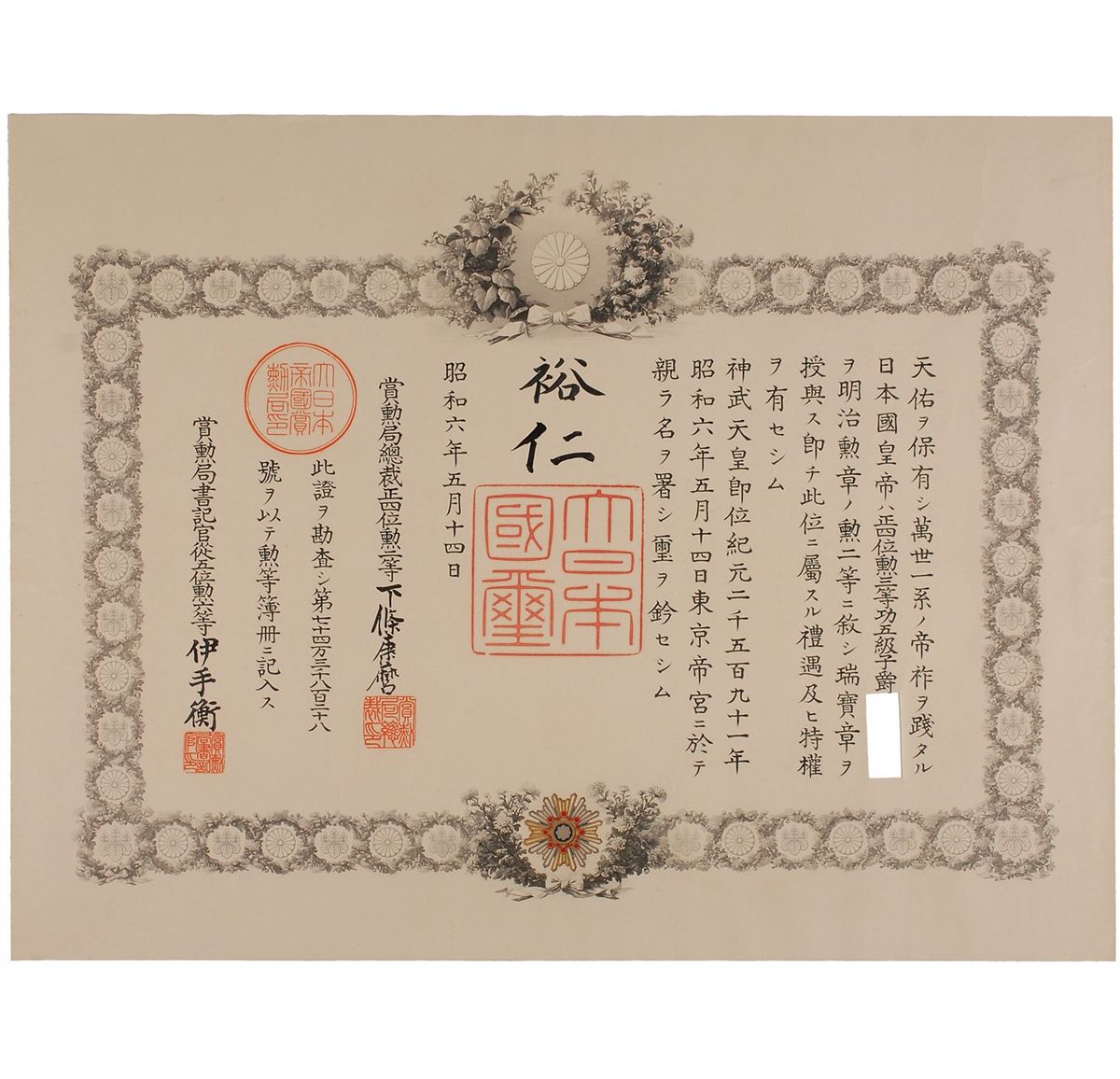 Beautiful DS in Japanese, signed by Hirohito as emperor of Japan, one page, 23 x 17.75, May 14, 1931. Untranslated document in which the emperor of Japan confers the Second Class, Order of the Sacred Treasure, Gold and Silver Star; the recipient’s name has been clipped out. Includes the Star of the Order of the Sacred Treasure award badge, measuring 3? in diameter, in its original presentation case. Also includes the original wooden box for the document. Aforementioned excision of the recipient’s name in the document and some wear to the enamel on the badge, otherwise overall fine condition.