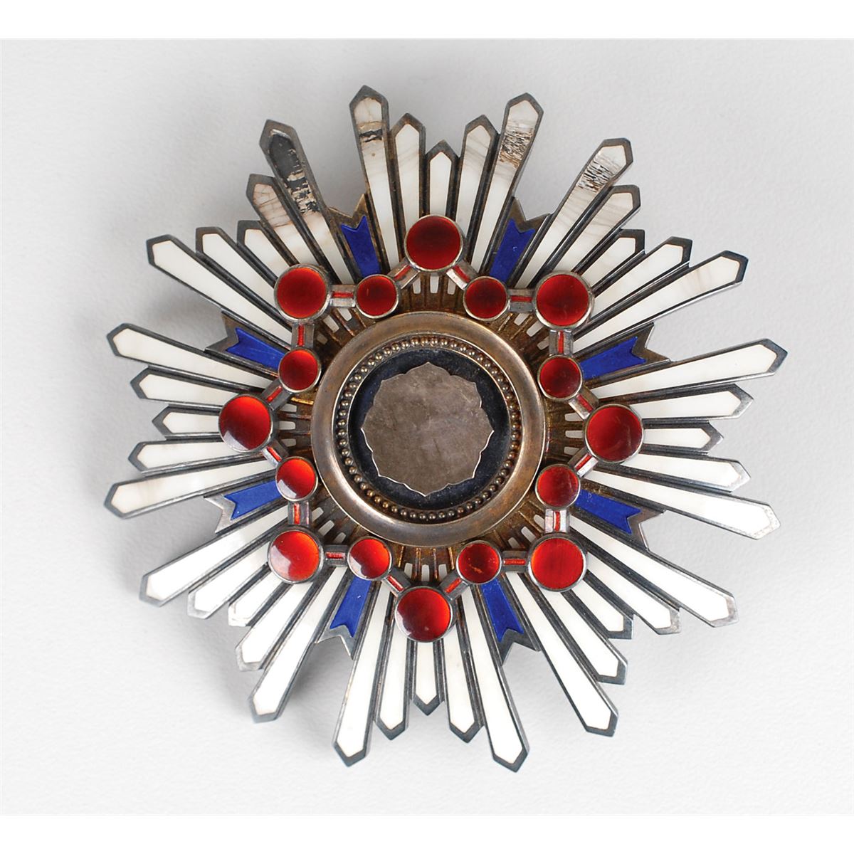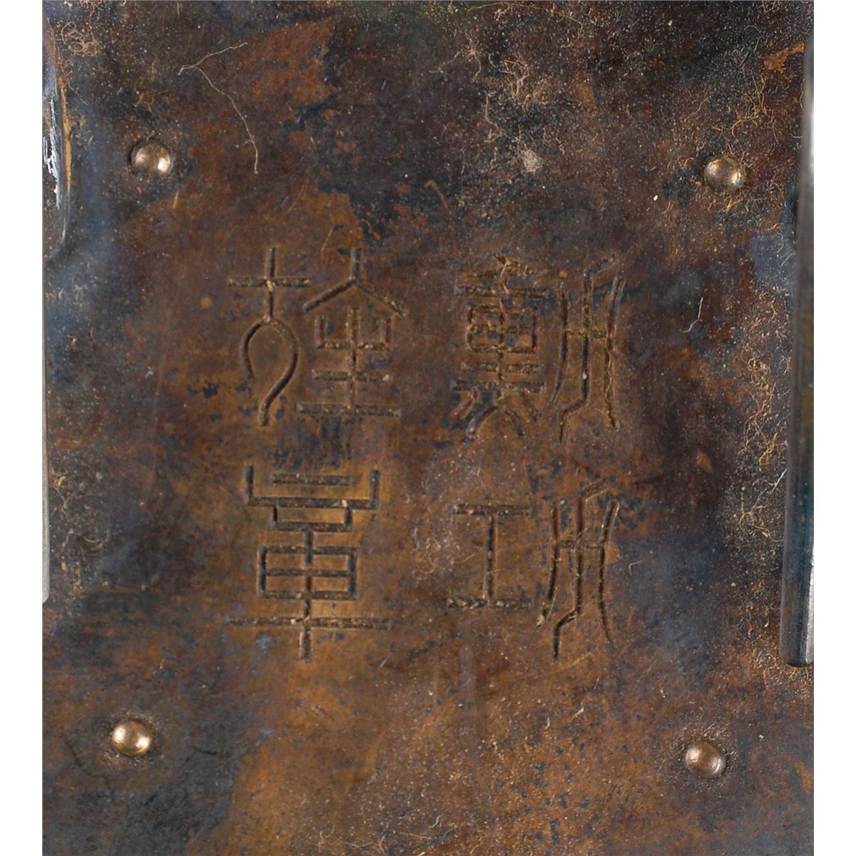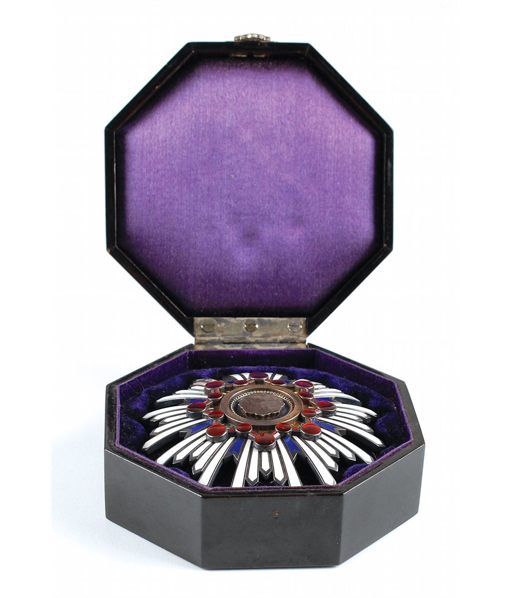 The insignia of the order incorporates symbols for the three imperial treasures, each represented in the badge: the central eight-pointed silver star represents the Yata Mirror, so sacred that not even the emperor is allowed to look at it; the wreath of red-enameled dots represents the the Yasakani Jewel; and the forty white enameled rays represent the emperor’s personal sword. Established as the Order of the Meiji in 1888 by Hirohito’s grandfather, the Order of the Sacred Treasure is awarded to those who have made distinguished achievements in a wide variety of civil or military services, ranging from research fields, to social work, to state and local government. These documents, by which the Emperor himself honors a citizen, become a part of the recipient’s family legacy and rarely leave Japan.