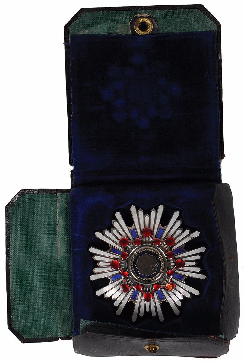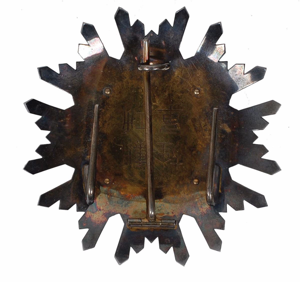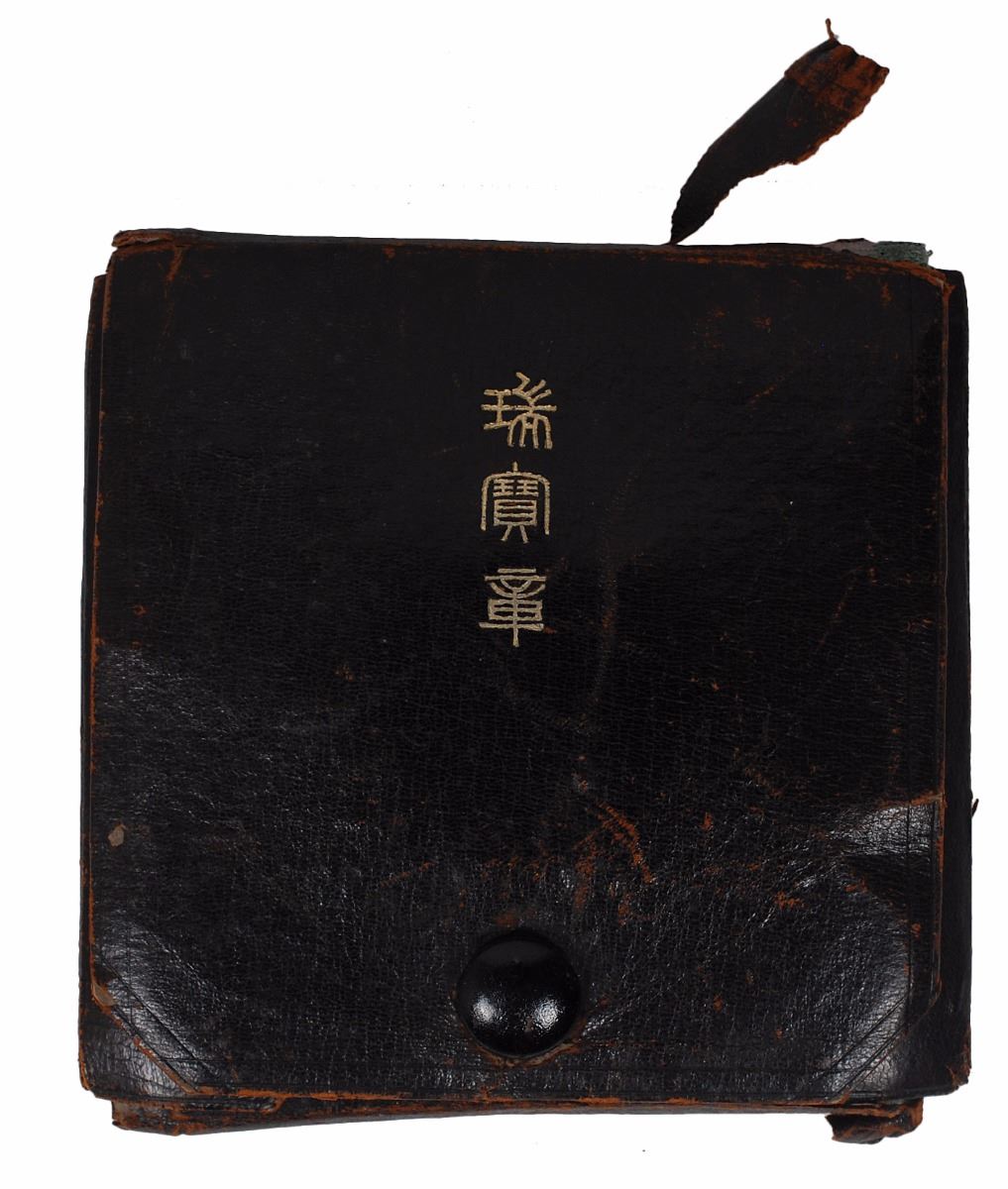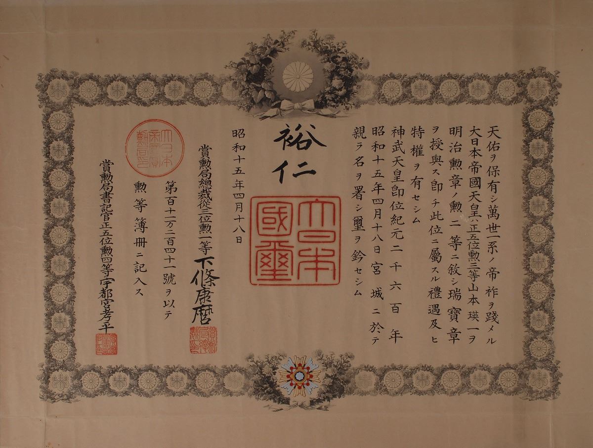 Included is the Star of the Order of the Sacred Treasure, 2.75? diameter, presented to Eiichi Yamamoto. “Kunko Seisho” is engraved on the reverse of the badge, which identifies it as praising achievement. Award is housed in its original 4 x 4 leather and felt case, gilt-imprinted on the cover that it is the Order of the Sacred Treasure, with the case showing expected minor wear. The insignia of the order incorporates symbols for the three imperial treasures: the Yata Mirror, so sacred that not even the Emperor is allowed to look at it; the Yasakani Jewel, made of the finest jade; and the Emperor’s personal Sword. White enameled rays represent the sword (slight chip on one of the 40 rays). The central disc bearing an eight-pointed silver star represents the mirror, surrounded by a wreath with red-enameled dots (one with slight chip) representing the jewel.