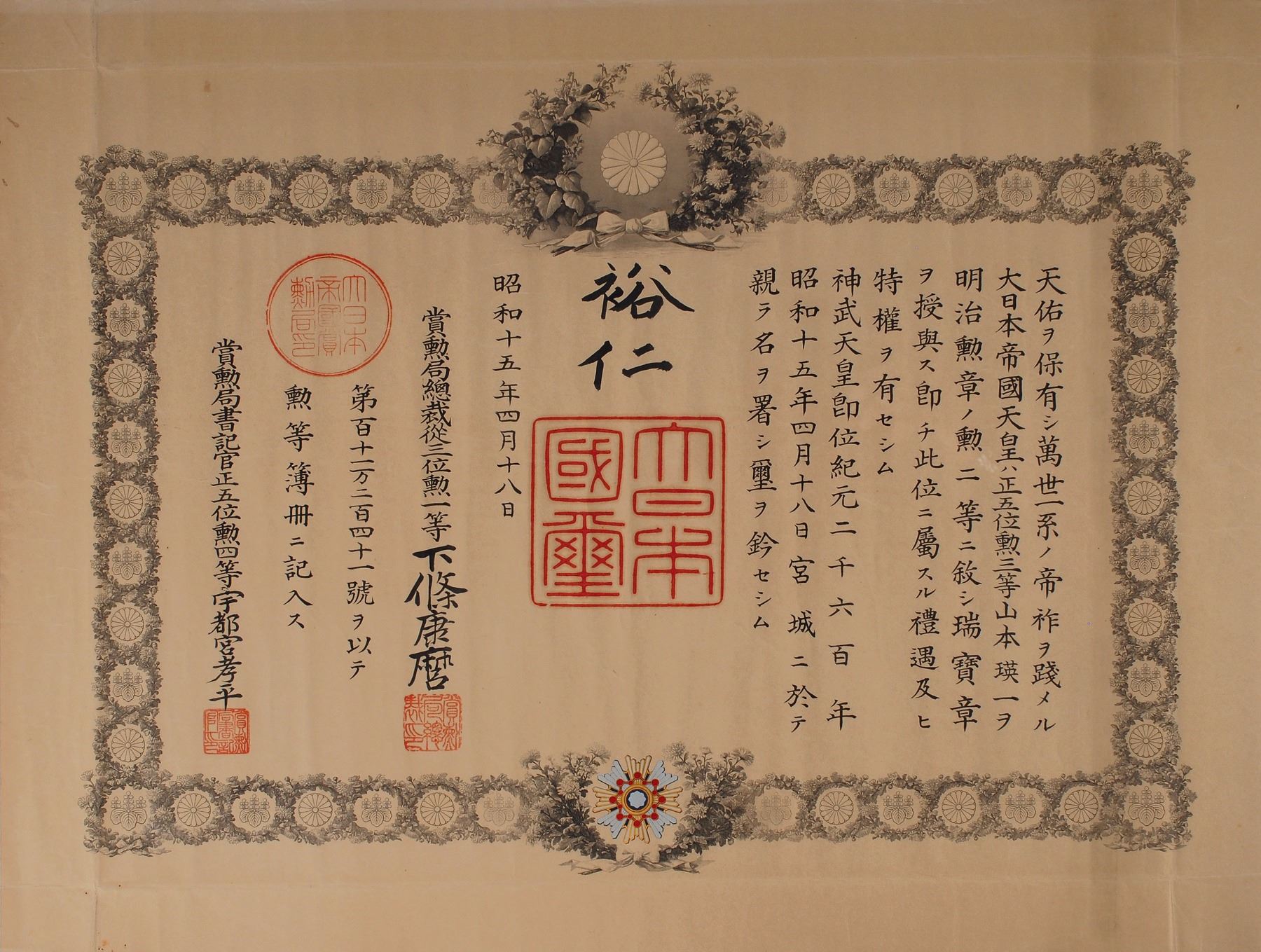 Established as the Order of the Meiji in 1888 by Hirohito's grandfather, the Order of the Sacred Treasure is awarded to those who have made distinguished achievements in a wide variety of civil or military services, ranging from research fields, to social work, to state and local government. These documents, by which the emperor himself honors a citizen, become a part of the recipient's family legacy and do not often leave Japan. A vibrant and highly sought-after piece, signed by the emperor just five months before Japan would sign the Axis Pact with Germany and Italy.