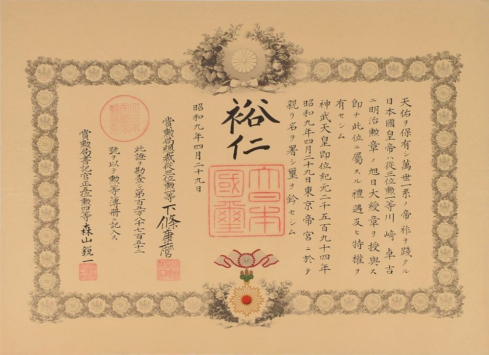 Exceptional DS in Japanese, one page, 23.25 x 17.75, April 29, 1934. Important document in which Emperor Hirohito confers the First Class, Order of the Rising Sun upon Kawasaki Takukichi. Includes the document's wooden box with green ribbon. In fine condition, with some light scattered wrinkling and creasing. Established in 1875 by Emperor Meiji, the Order of the Rising Sun is given to honor those who have made significant achievements in international relations, the promotion of Japanese culture, advancements in their field, development in welfare, or the preservation of the environment. The recipient of this award, Kawasaki Takukichi, was a politician and cabinet minister in the pre-war Japanese empire. As a leader of the Minseito party, he was an outspoken opponent of the growing influence of fascism. A superb example of a rare first class honor.
