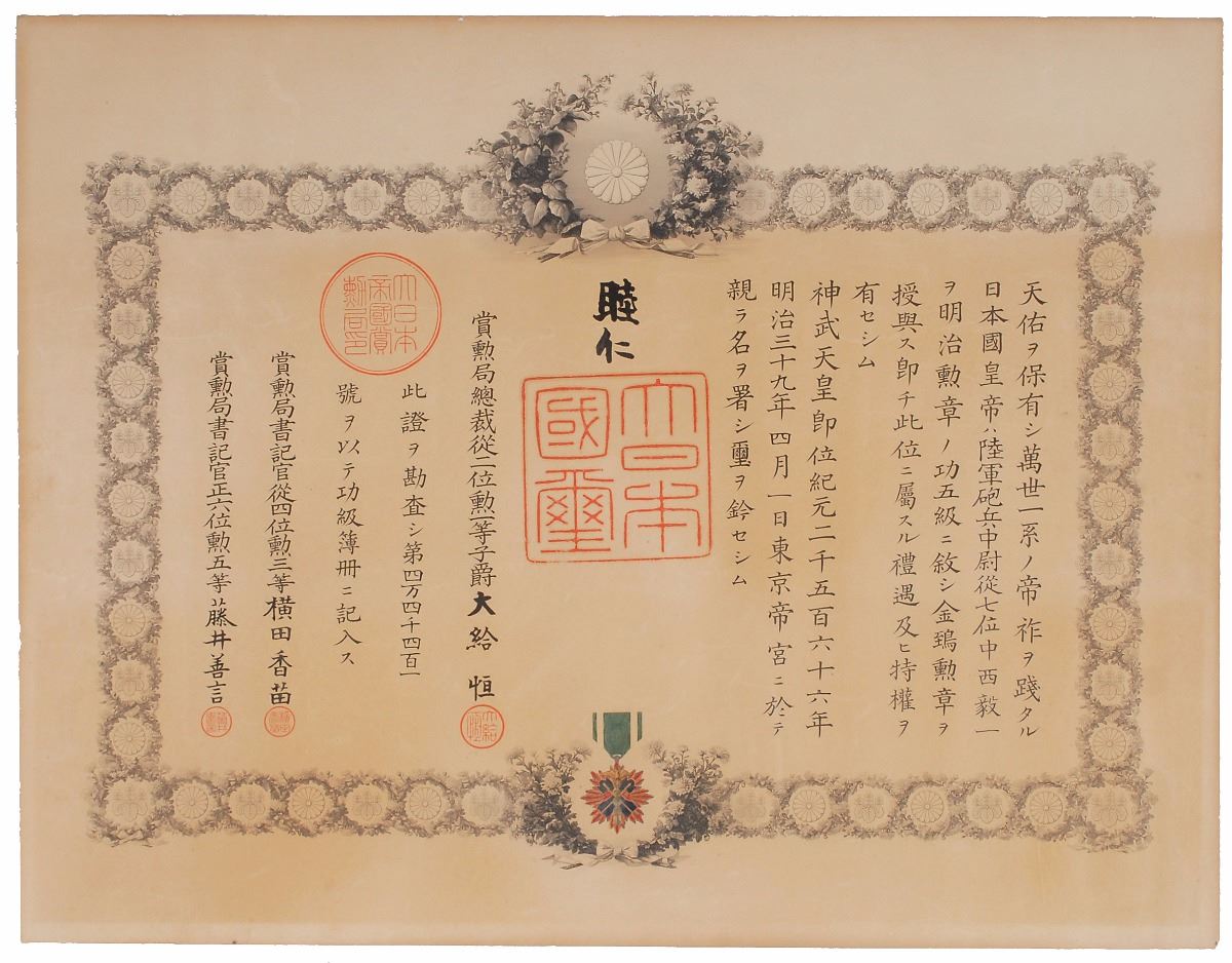 Established in 1890 by Emperor Meiji, the Order of the Golden Kite was a military award commemorating the mythic Jimmu Tenno, the ‘Romulus of Japan.’ It was awarded to soldiers and military officers who demonstrated bravery, leadership, or command in battle. This is one of the few orders made exclusively for the Japanese military, while most others could be given to civilians, diplomats, and other officials including those from other countries. The majority of these Order of the Golden Kites awards were given in the lower sixth or seventh class, making this middle-class example scarcer than usual.